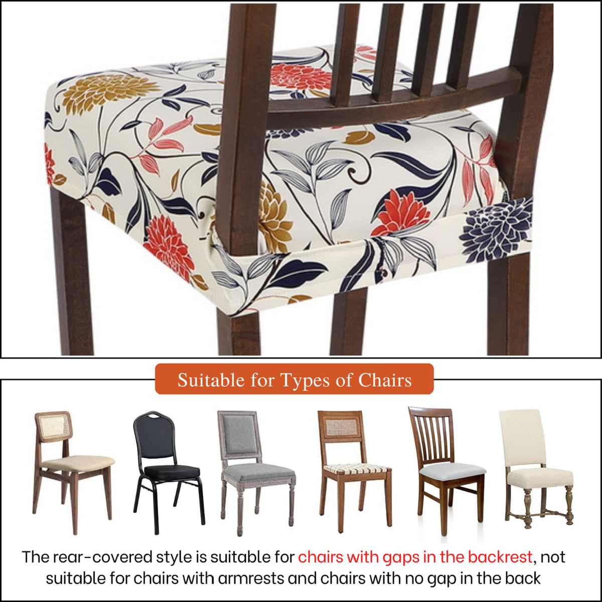 Q: Are these chair covers suitable for different types of chairs?A: These seat covers are designed to fit a variety of upholstered dining chairs, making them suitable for use in dining rooms, hotels, kitchens, restaurants, and more. However, please note that they are not fitted for armed chairs.