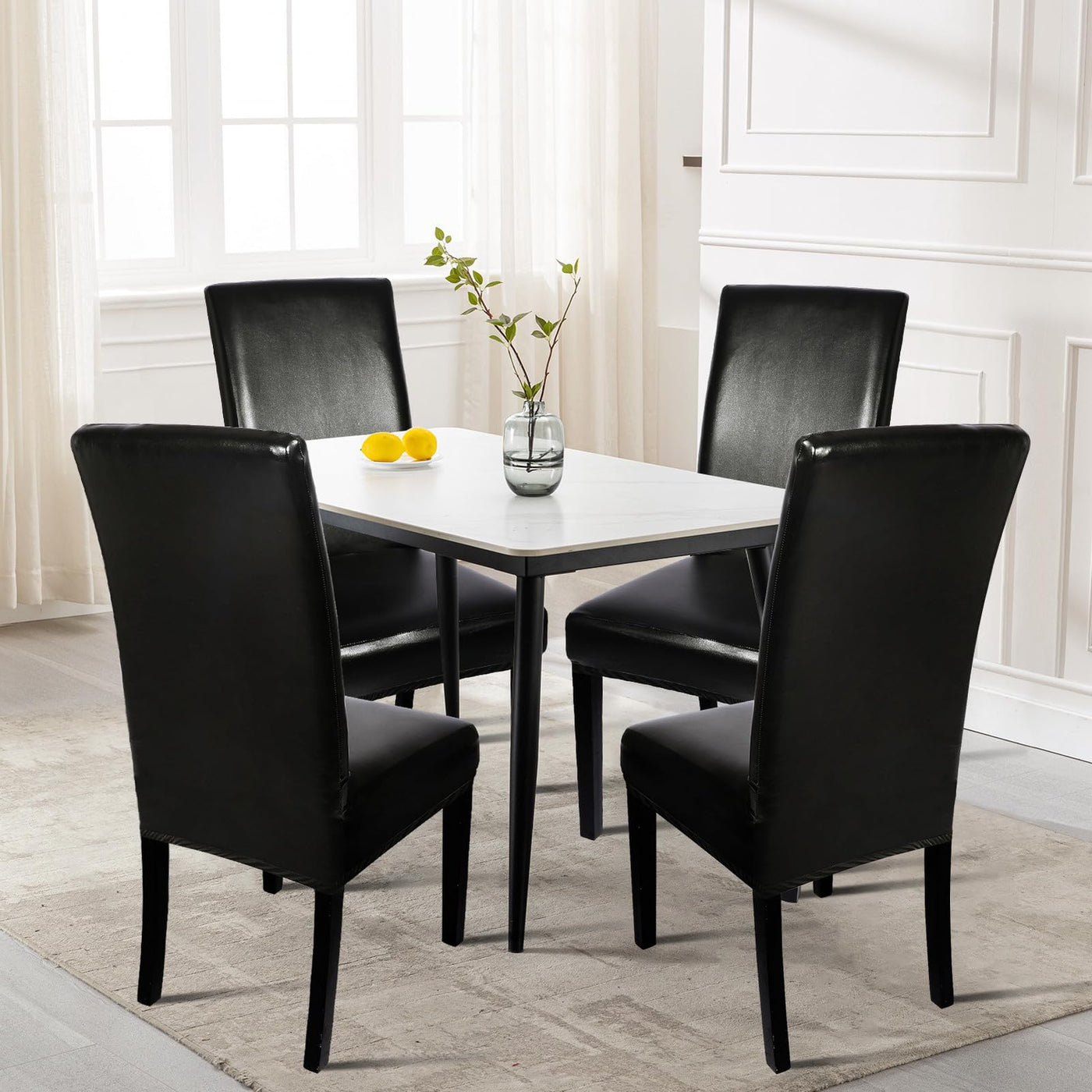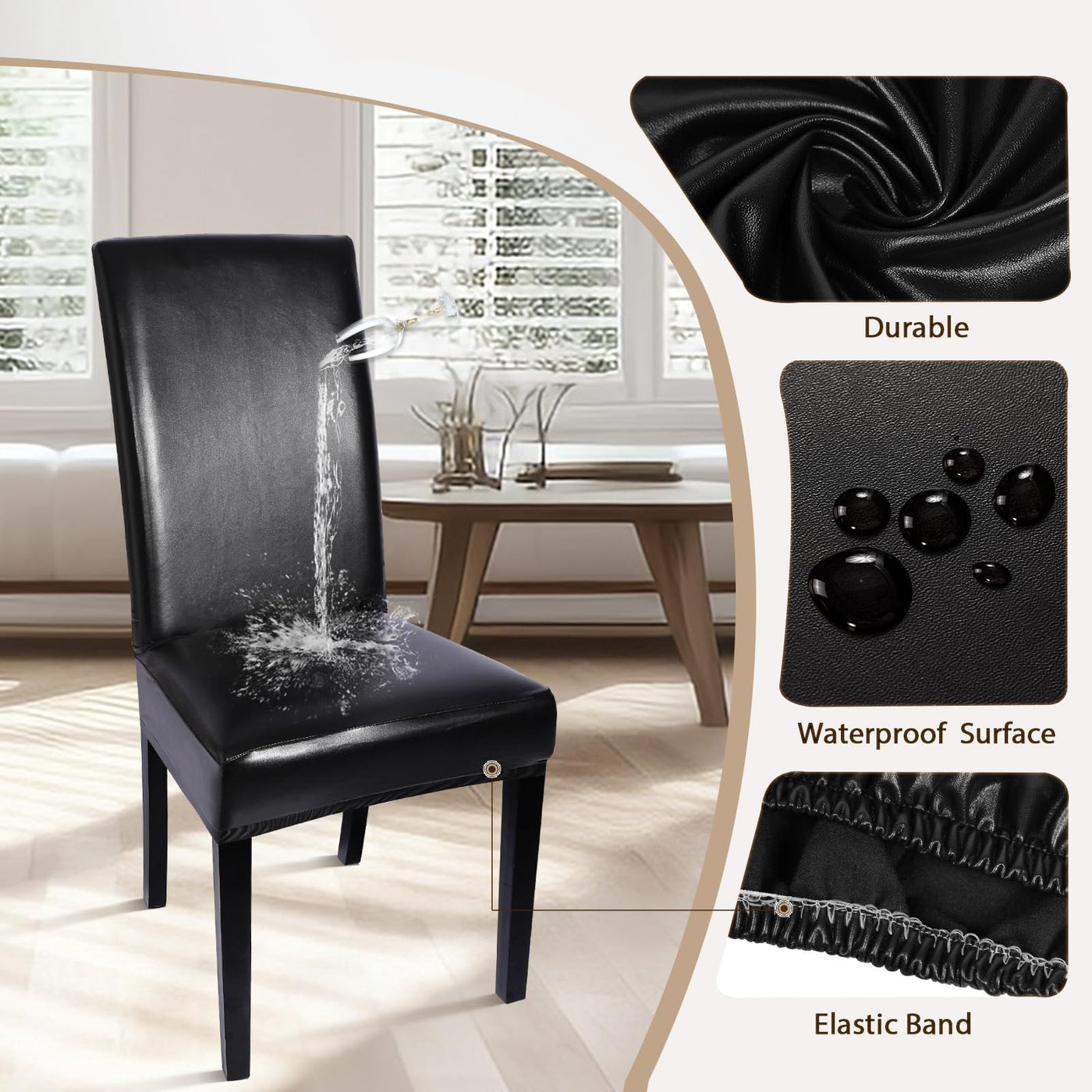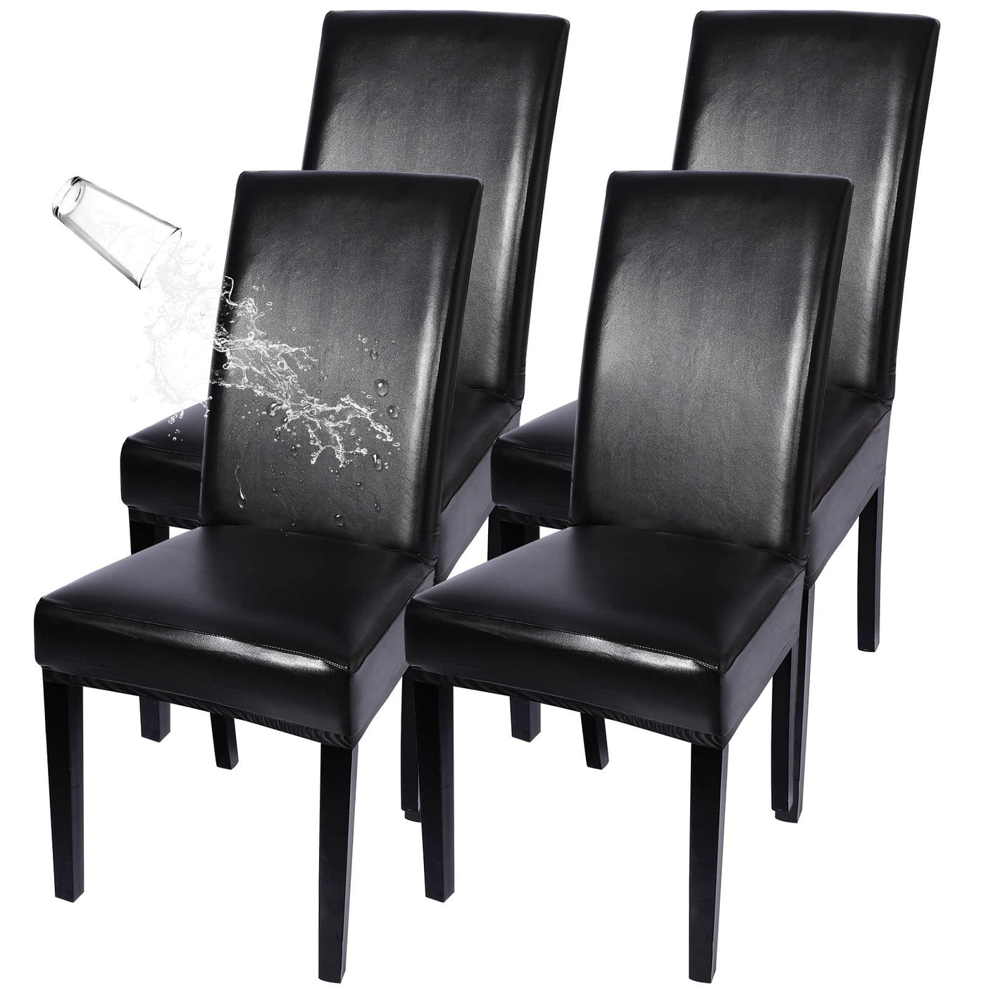 Q: Can these chair covers protect against spills and stains?A: Absolutely! The SearchI Waterproof PU Leather Chair Covers are made from high-quality PU leather that effectively prevents water, drinks, and spills from soaking through, keeping your dining chairs safe from stains and damage.