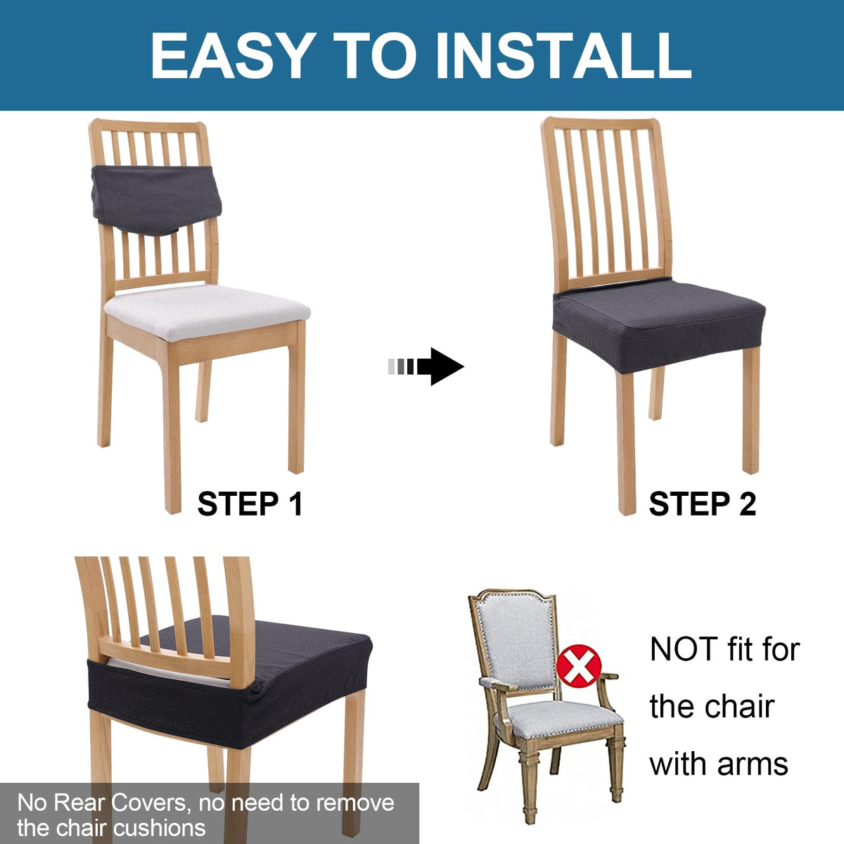 Smiry Waterproof Seat Covers For Dining Room Chairs Set Of 2, Stretch Jacquard Removable Washable Chair Seat Slipcovers Protector, No Rear Covers, Dark Grey
