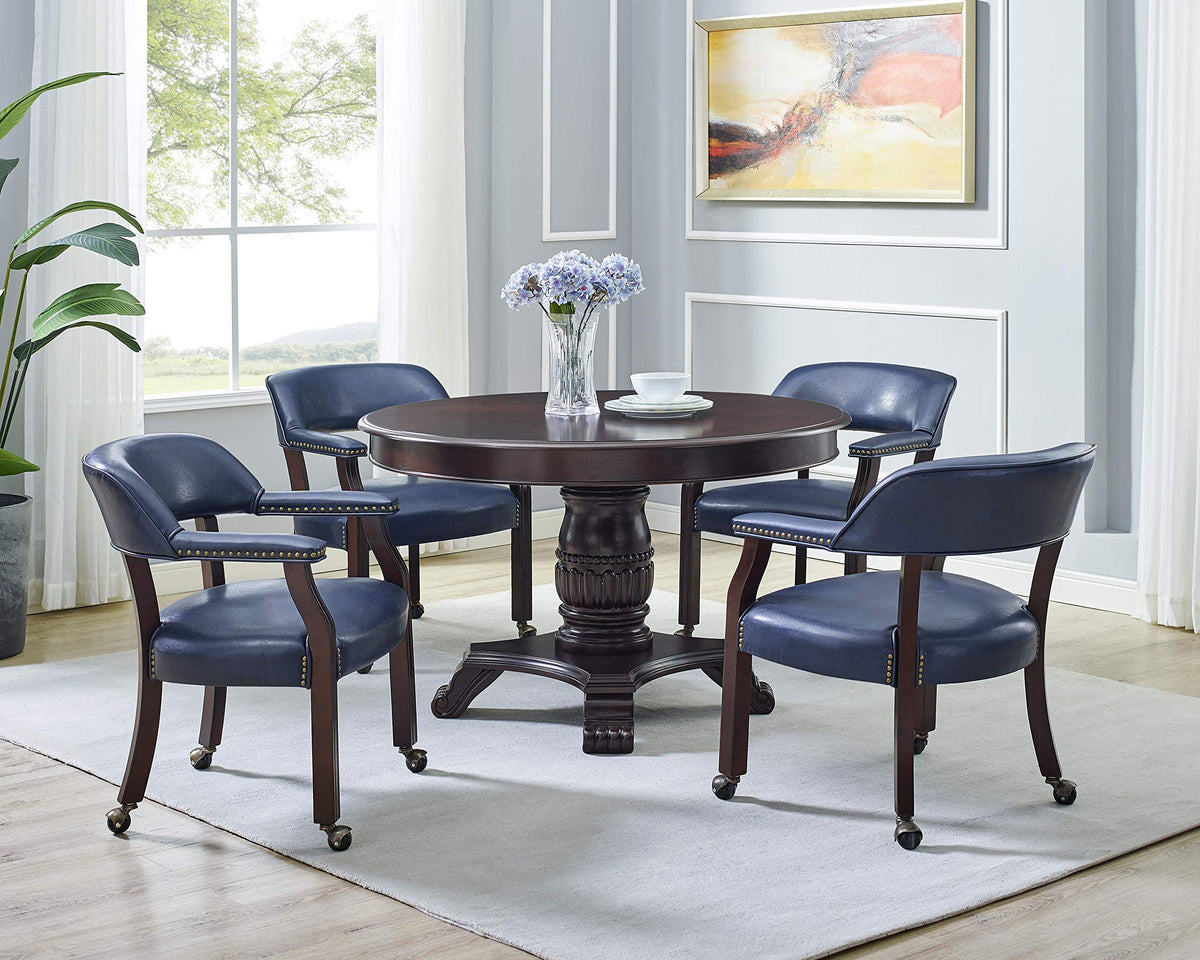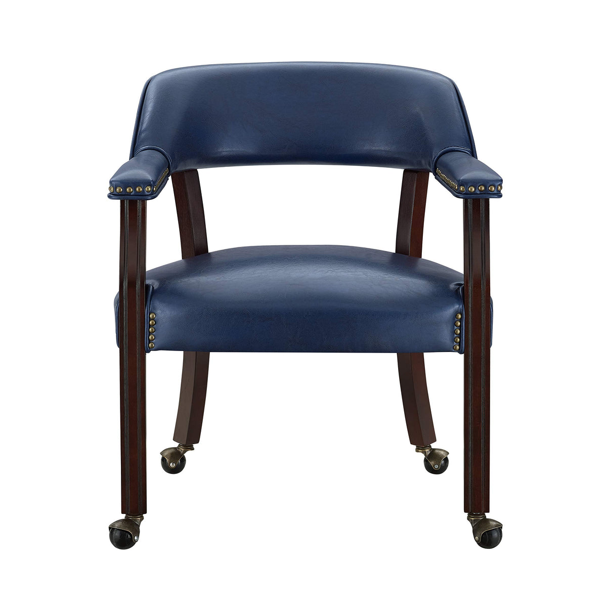 Enjoy Both Game Night And Dining Night With This Dual-Purpose Dining And Game Chair. This Upholstered Captain'S Chair Is Castered For Easy Mobility And Is Shown In Black With Other Colors Available. The Chair Features Nailhead Trim And Rich Cherry Colored Finish To Work Well On Game Night Or For Dining. Upholstered In Vinyl, This Captain'S Chair Is Easy-To-Clean And Extremely Comfortable.