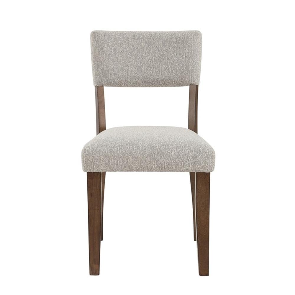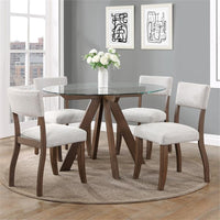 Open And Airy, The Wade Dining Set Is Transitional Style In A Compact Dining Set. A Glass Top Table Frames Up A Beautiful Timber Beam Base While The 48-Inch Diameter Top Easily Accommodates Four Comfortably. But The Real Star Of The Collection May Be The White Nubby Upholstered Chairs That Contrast Perfectly With The Mocha Finished Legs And Table Base.