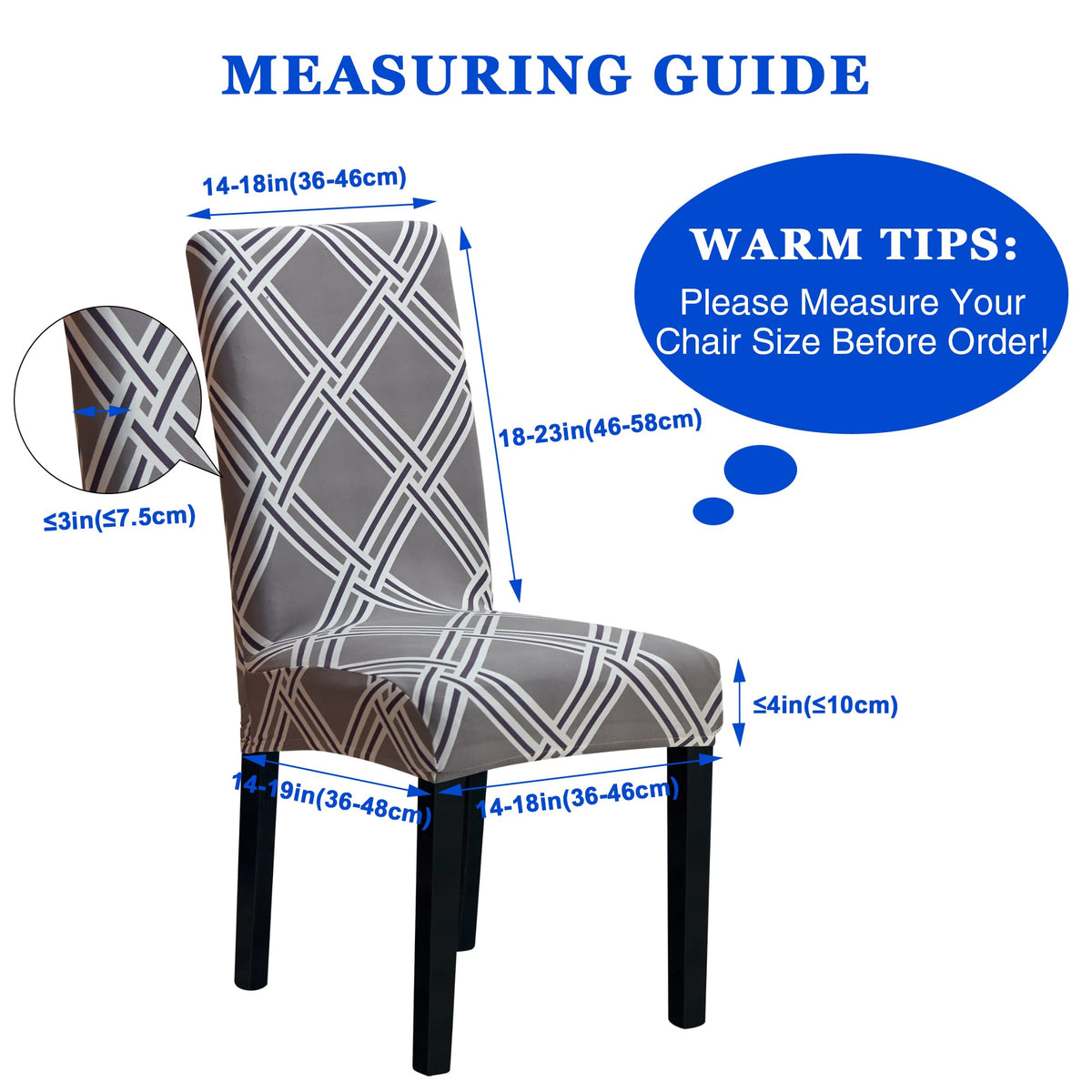 These Chair Covers Are Suitable For Most Chairs With Backrests And No Armrests, Because They Are Made Of Stretch Fabrics. You Can Refer To The Chair Styles Listed In The Picture. Before Purchasing, Please Confirm The Size Of Your Chair: Backrest Height: Between 18 And 23' Backrest Width: Between 14 And 18' Seat Length: Between 14 To 19' Seat Width: Between 14 And 18' Seat Thickness: Less Than 4'