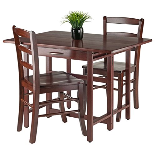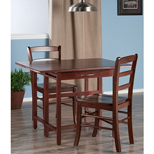 The Taylor Drop Leaf Table Set includes a versatile table and two Ladder Back Chairs. The table can be extended to double its size, making it perfect for dining in the kitchen or breakfast nook. It can also be used as a console with the leaf down or as a gaming table in the family room. The table features a wide drawer for storage and is made of solid wood for durability. The chairs are made of solid wood and finished in a rich Walnut. Assembly is required. The overall size of the table with the leaf extended is 41.7"W x 30.5"D x 29"H. The table has folding side panels to support the drop leaf and a brushed nickel handle on the drawer. Each table leg has a built-in floor protector. The chairs have an overall size of 16.60"W x 20.50"D x 34.70"H and a seat height of 18". The maximum weight capacity is 220 lbs. The set ships in 2 boxes with dimensions of 41.73" W x 30.51" D x 29.13" H and a weight of 41.95 lbs.