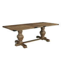 With a traditional, classic rustic flair, this dining table easily makes an elegant fit for your dining space. Featuring a clean lined rectangular tabletop with metal corner brackets and rivet accents, it is crafted from sturdy rubberwood and gorgeous veneer in a natural brown finish. All supported atop a double pedestal style base. Check out our Tyler collection for color options.