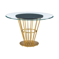 Make a chic and sophisticated statement with the Veronica Round Dining Table with a Glass top, Walnut Panel, and Metal base by Armen Living. With minimalistic and industrial notes, our dining table invokes a chic and contemporary tone in any room. Its glass tabletop is rests on a round walnut veneer panel for a beautiful contrast of materials. The conical base achieves a sleek and airy presence within its metallic detailing. The Veronica dining table serves as a stunning centerpiece for your kitchen, dining, or living space, and its round shape creates a natural hub for inclusive conversations and activities. With a diameter of 48'', this dining table can comfortably seat up to 4 people. It offers plenty of aesthetic appeal and comfort to your intimate dinners and family gatherings. This dining table is constructed with high-quality materials and craftsmanship to offer style and functionality for years to come. The Veronica Round Dining Table is available in a Glass tabletop and Walnut Panel with a Black Iron, Brushed Stainless Steel, or Gold Stainless Steel base to effortlessly complement your home.