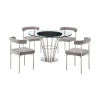 Bring sleek sophistication and comfort to your dining space with the Veronica Shannon 5 Piece Dining Set by Armen Living. This set includes 1 Veronica Round Glass Dining Table and 4 Shannon Upholstered Dining Chairs. With a chic and refined aesthetic, this dining set is ready to make a statement. The dining table includes a 48'' glass tabletop that rests on a round walnut veneer panel for a beautiful contrast of materials. The conical base attains a sleek and airy presence with its metallic detailing. The Veronica dining table serves as a stunning centerpiece for your kitchen, dining, or living space, and its round shape creates a natural hub for inclusive conversations and activities. Our Shannon dining chairs serve as a perfect compliment to create this contemporary and modern dining set. The Shannon chair includes a cylindrical cushion and curved backrest to offer perfect back support and a generously padded seat to provide a comfortable seating experience. These chairs are covered in performance fabric to offer easy care and maintenance. This dining set can grace your kitchen, dining room, or living space to make a stunning centerpiece, while it adds a dose of sophistication and comfort from your casual to formal meals. The dining set features quality materials and craftsmanship to serve you for years to come. The Veronica Shannon 5 Piece Round Glass Dining Table Set is available in matching finishes and a variety of colors, or sold separately to achieve any look you desire.