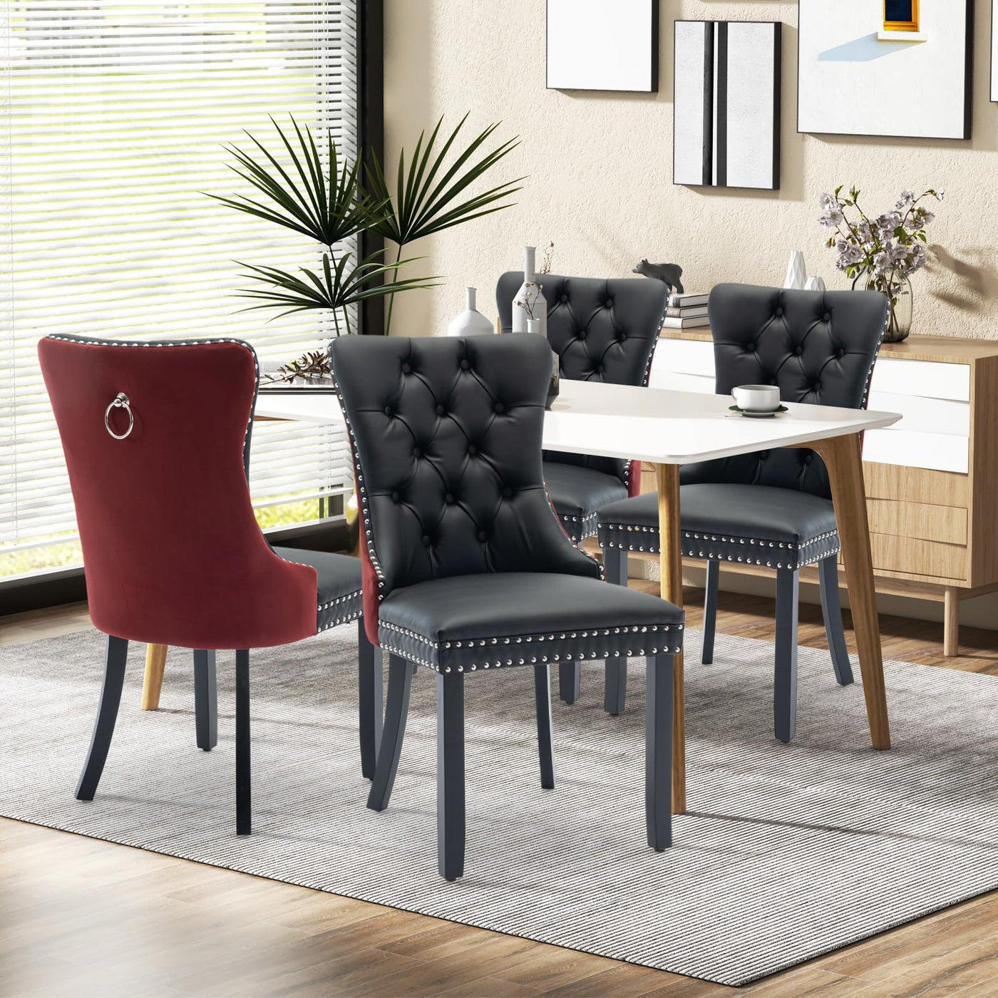 Vicbarley Leather Dining Chair Set Of 4 Upholstered Tufted Dining Room Chair With Nailhead Trim And Rubber Wood Legs For Kitchen, Restaurant, Black/Red