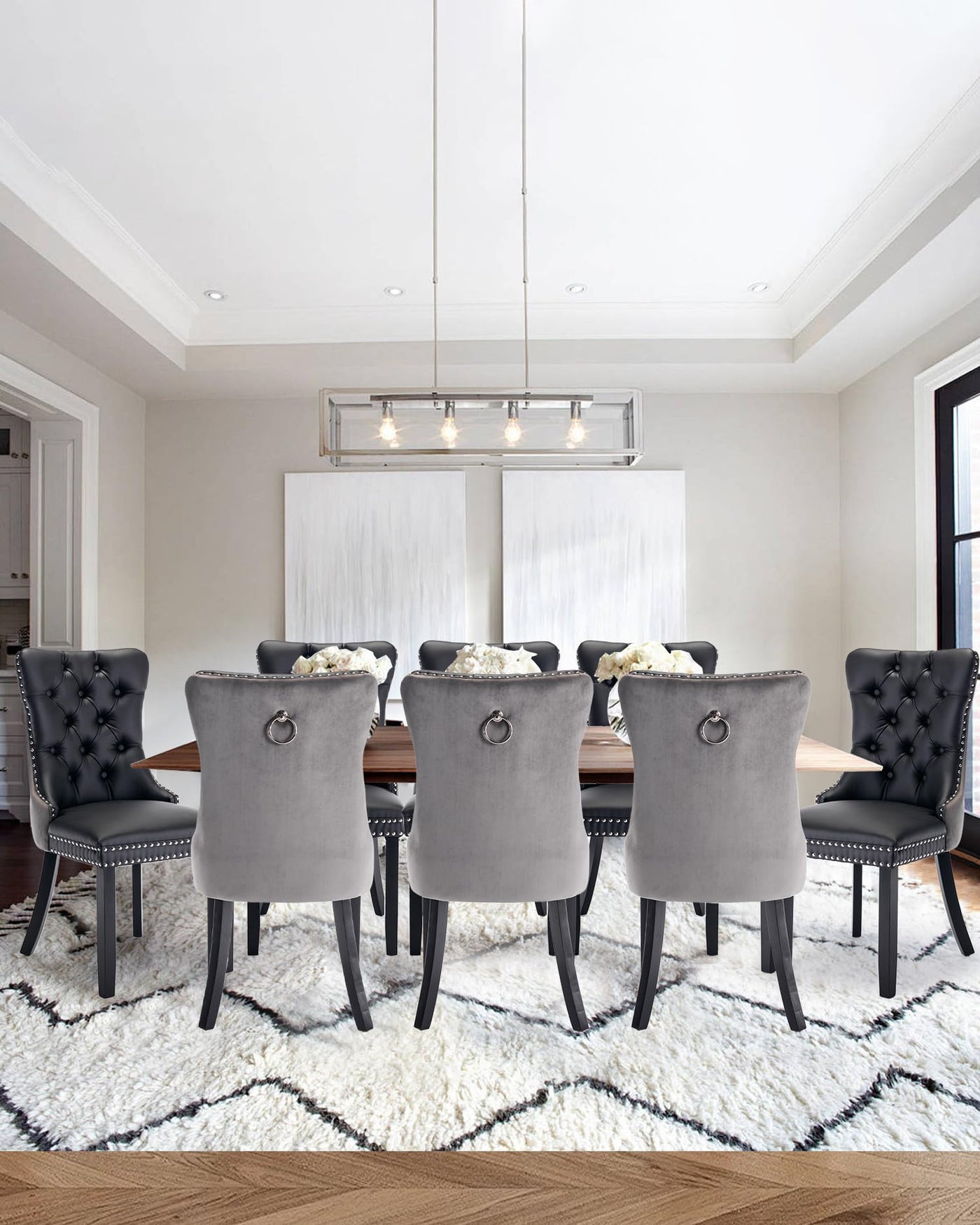 Vicbarley Leather Dining Chair Set Of 8 Upholstered Tufted Dining Room Chair With Nailhead Trim And Solid Wood Legs For Kitchen, Restaurant, Black&Grey