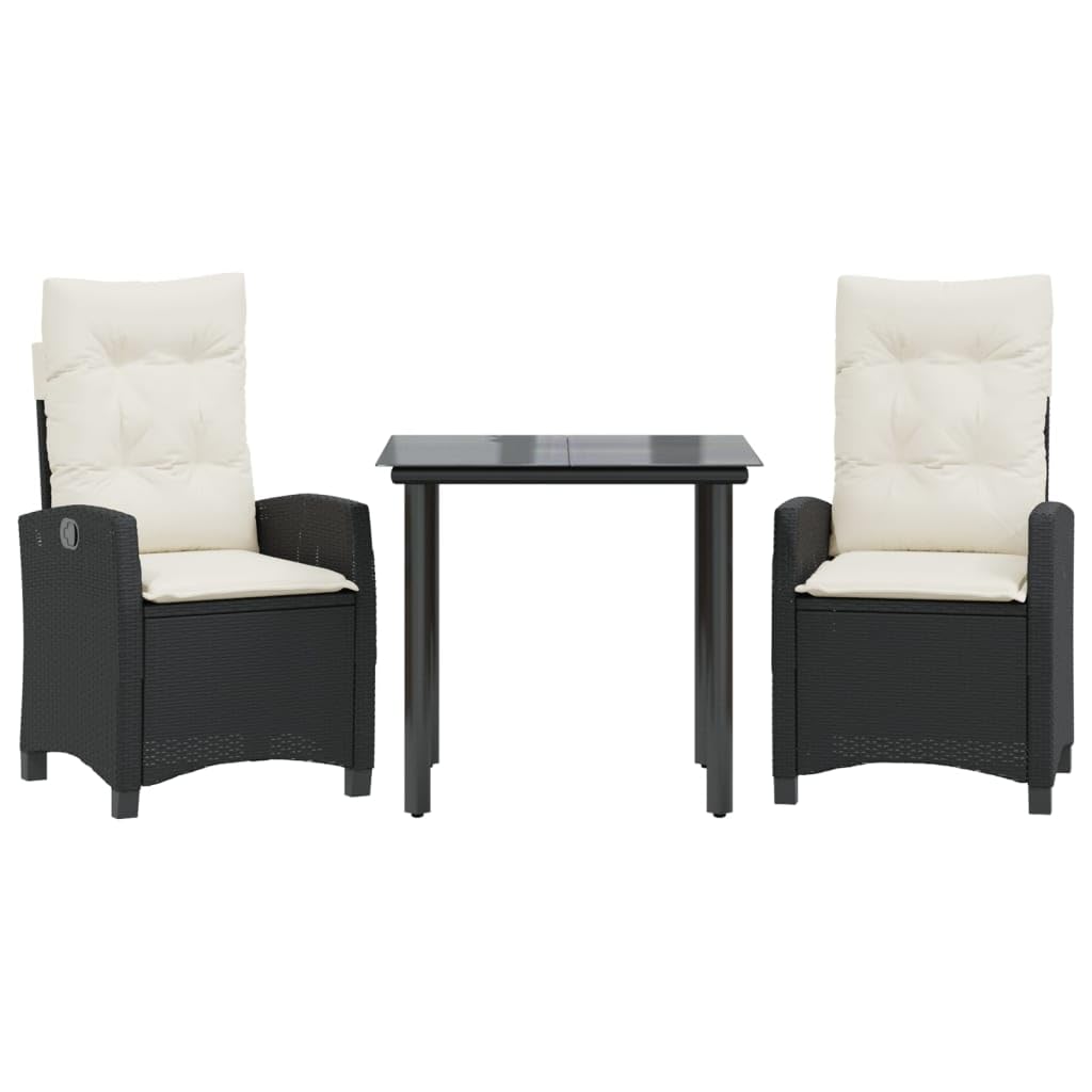 vidaXL 3 Piece Patio Dining Set - Black Poly Rattan, Cushions, Adjustable Back, Tempered Glass Table for Garden/Patio/Backyard