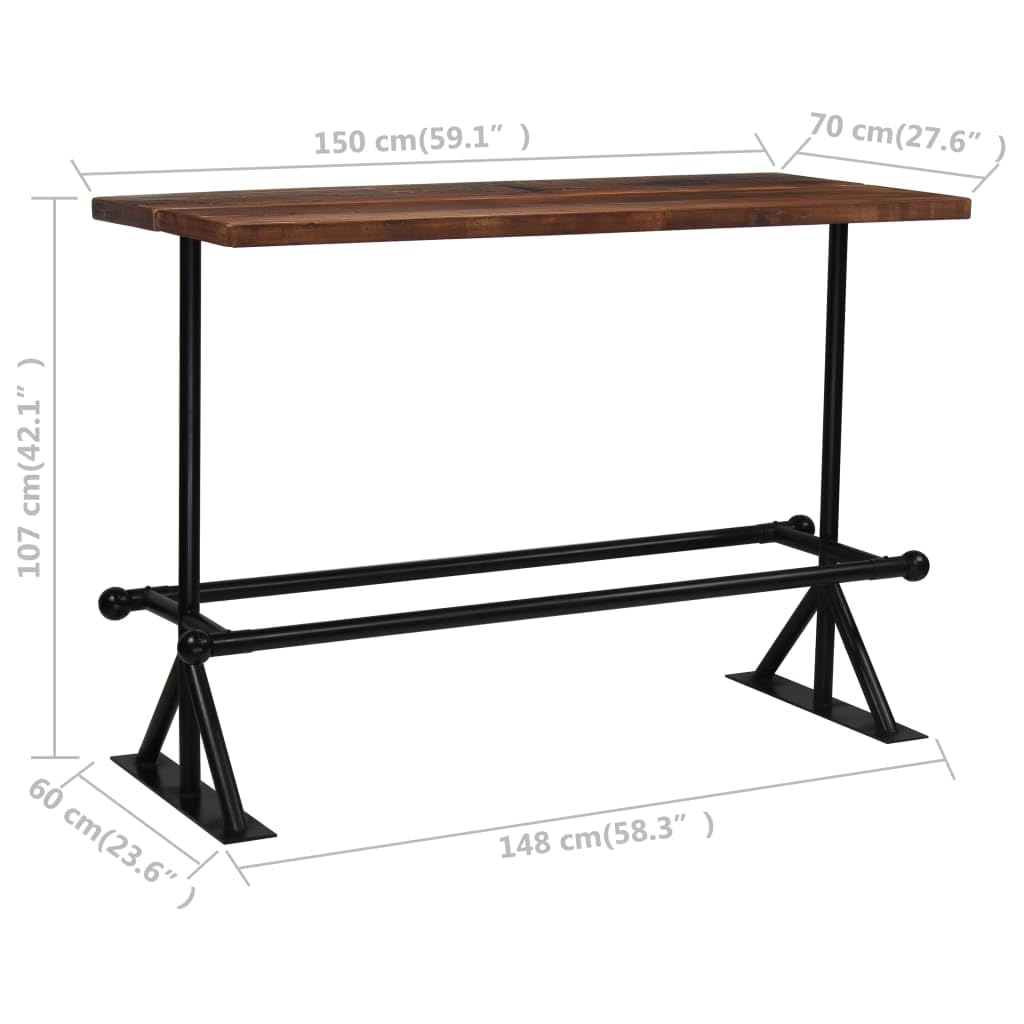 This wooden bar set in a retro look oozes industrial style and will make a striking addition to your decor. The bar table and chairs are made of solid reclaimed wood that has been sourced from joists, floors and support beams from old buildings being demolished, and can consist of different types of wood like pine, teak, beech, oak, cedar, mango wood, acacia, etc. This means the reclaimed wood retains the characteristics of these different types of wood. Reclaimed wood is already aged, weathered and dried, so it doesn't shrink or bend. The beautiful wood grains make every piece of furniture unique and slightly different from the next. Signs of wear and visible grain structure also give the set its own history and a unique look. Every step of the process is carried out with the greatest care, be it polishing, painting or lacquering. The steel frame ensures the set's sturdiness and stability but contributes to its industrial style as well. The footrests add to the seating comfort. Assembly is easy. Delivery includes 1 bar table and 6 bar chairs. Important note: Colours vary from piece to piece, making each of our items unique; the delivery is random.
