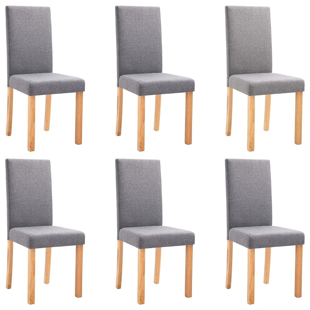 Delivery includes 6 dining chairs. Color: Light Gray Material: Fabric + Rubber wood frame Total dimensions: 16.5" x 20.1" x 37.4" (W x D x H) Seat width: 16.5" Seat depth: 15.7" Back height: 19.3" Seat height from the ground: 18.1" Delivery includes 6 dining chairs