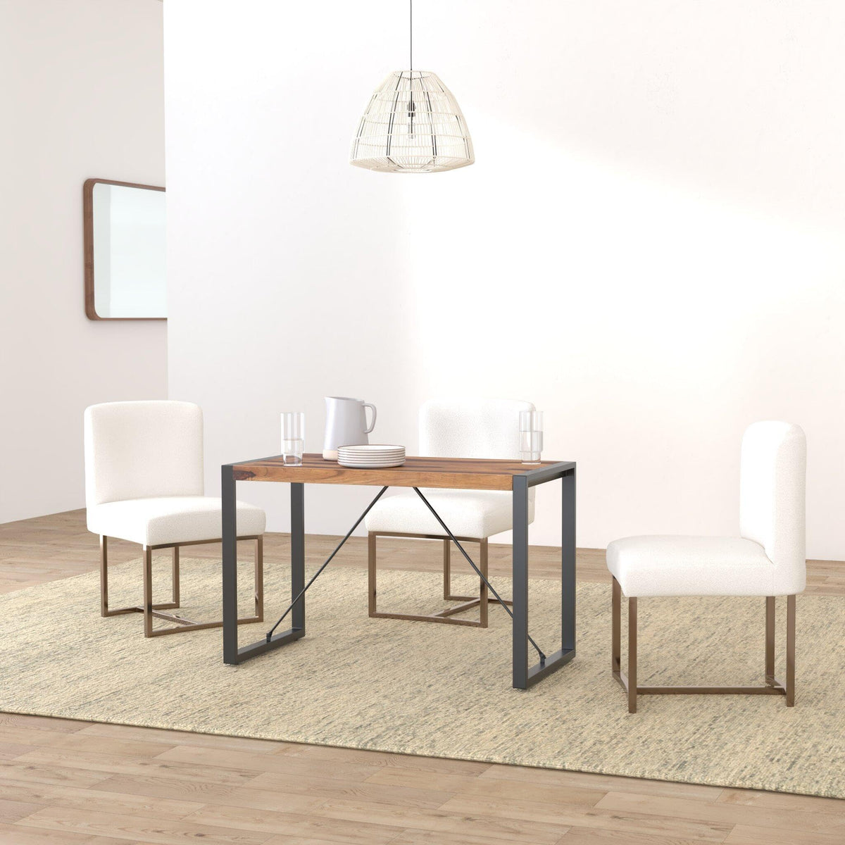 This striking wooden dining table in the industrial style will make a distinctive addition to your kitchen or dining room. This dinner table is made of solid Sheesham wood, which is also known as rosewood or Palisander, is a tropical hardwood that is famous for its natural grains and smooth texture. Additionally, it doesn't warp or split. The exquisite craftsmanship adds to the table's spectacular retro style. The powder-coated steel legs complete the industrial look. Every step of the process is carried out with the greatest care, be it polishing or lacquering. Assembly is easy. Important note: The solid Sheesham wood shows natural grains, making each of our dining tables unique and slightly different from the next. The delivery is random, ensuring the exclusivity and individuality of your product.