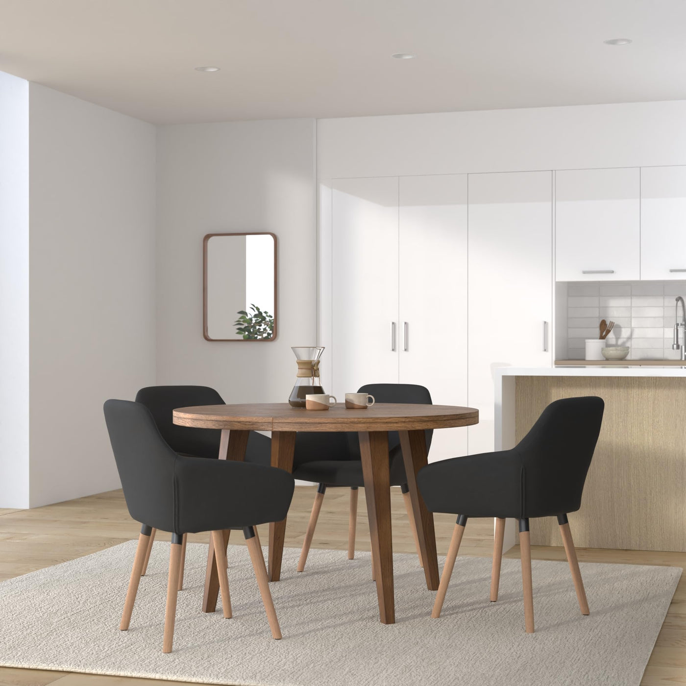 Made from quality fabric, this set of 2 dining chairs is aesthetically and ergonomically designed to make a cozy highlight in your home. It provides a comfortable place for your family to have dinner in the dining room or read and rest in the living room. Thanks to the thickly foam padded seat, armrests and backrest, our chairs will surely bring you optimal seating comfort. Additionally, the black metal and solid wood legs bring super stability and ensure the chairs excellent durability. Delivery includes 2 dining chairs.