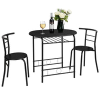 Features: Available In Walnut,Black,Natural Wood And White Oak. Set Includes 1 Dining Table And 2 Chairs. Made Of Mdf And Pvc Veneer And Metal Frame. A Wine Rack For More Storage Space. Easy To Assemble With Instructions Provided Specifications: Material: Wood, Iron Table Dimensions: 31.5''(L) X 20.87''(W) X 29.9''(H) Seat: 13.8''(Dia) Floor-To-Seat: 16.7''(H) Package Includes: (1) One Table (2) Two Chairs (3)Instructions (4)Hardware