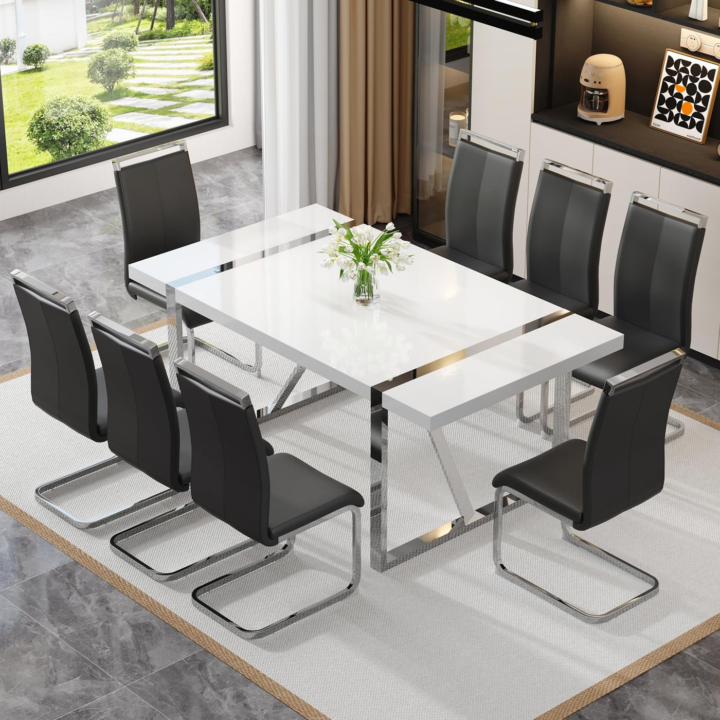7 Piece White Rectangular Dining Table Set:Simple And Delicate White Table Top With Silver Metal Frame Perfectly Matches Any Decoration Style. Modern Pu Leather Chair With A Strong U-Shaped Base Can Be Placed In The Kitchen, Dining Room And Living Room. Modern Dining Room Table Set 6 :The Mdf Table With Metal Frame Can Bear Up To 500 Pounds. The Table Top Is Easy To Clean And Maintain, And Only Needs To Be Wiped With Dry Towel Or Wet Towel.The Seating Capacity Of The Table Is 4/6, Which Will Meet Your Needs For Gathering With Friends Or Family. Details For Perfection:The Leather Surface Feels Comfortable And Waterproof, And Is Easy To Clean And Maintain. The Chair Seat Is Filled With High-Density Sponge To Improve The Sense Of Use Of The Product. The Ergonomically Designed Chair Shape Supports Your Spine For Added Comfort.'