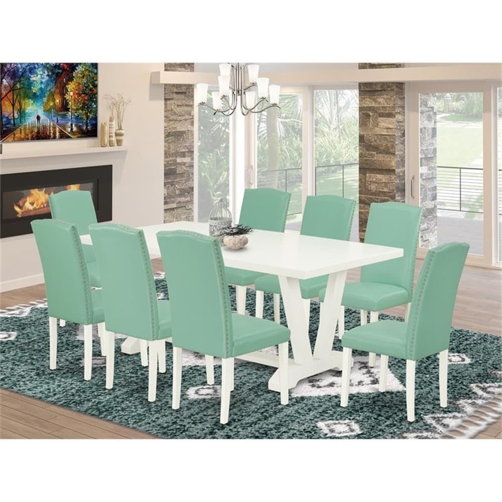 EAST WEST FURNITURE - V027EN257-9 - 9 PIECE DINING ROOM TABLE SETOur modern dining table set adds a touch of elegance to any dining room that you and your family will absolutely enjoy. The elegant 9 Piece dinette set includes a modern kitchen table and 8 parson chairs. This rectangular wooden dining table top is offered in a Linen White finish. In addition, the upholstered dining chairs in a Pond PU Leather enhance the elegance of any home. Ideal for dinette, kitchen and dining areas, this multi-functional modern dining set seats up to 8 people, perfect for families to enjoy mealtimes together. A great addition to your dining area and a perfect ensemble that will strike your guests with its best impression. We have created these Pond finish upholstered dining chairs and wood dining table with the help of highly experienced carpenters, who generate a smooth and high-end finish to this modern dining set. Dining chairs of the kitchen dining table set can be moved under the kitchen table when you finish your meal, which our dining set largely helps you save room space. Designed with easy and fast assembly in mind, each set comes conveniently flat packed with easy-to-follow instructions and all necessary tools included. Our superior quality kitchen dining table set is perfect for you and your dining area as well as the kitchen area. Our mid century modern dining set is quite easy to clean and always offers a great appeal. The mid century dining set adds a refined touch to even your most casual family dinners. Keep Enjoy With East West Furniture!MODERN DINING SET FEATURES:? Wood Material: Rubberwood? Seat Material: PU Leather? Wooden Table Top Color: Linen White? Dinner Table Legs Color: Wire Brushed Linen White? Parson Chairs Fabric Color: Pond? Upholstered Dining Chair Legs Color: Linen White? Kitchen Chairs Back Style: High Back? Table Dimensions: Length: 72; Width: 40; Height: 30.? Chair Dimensions: Length: