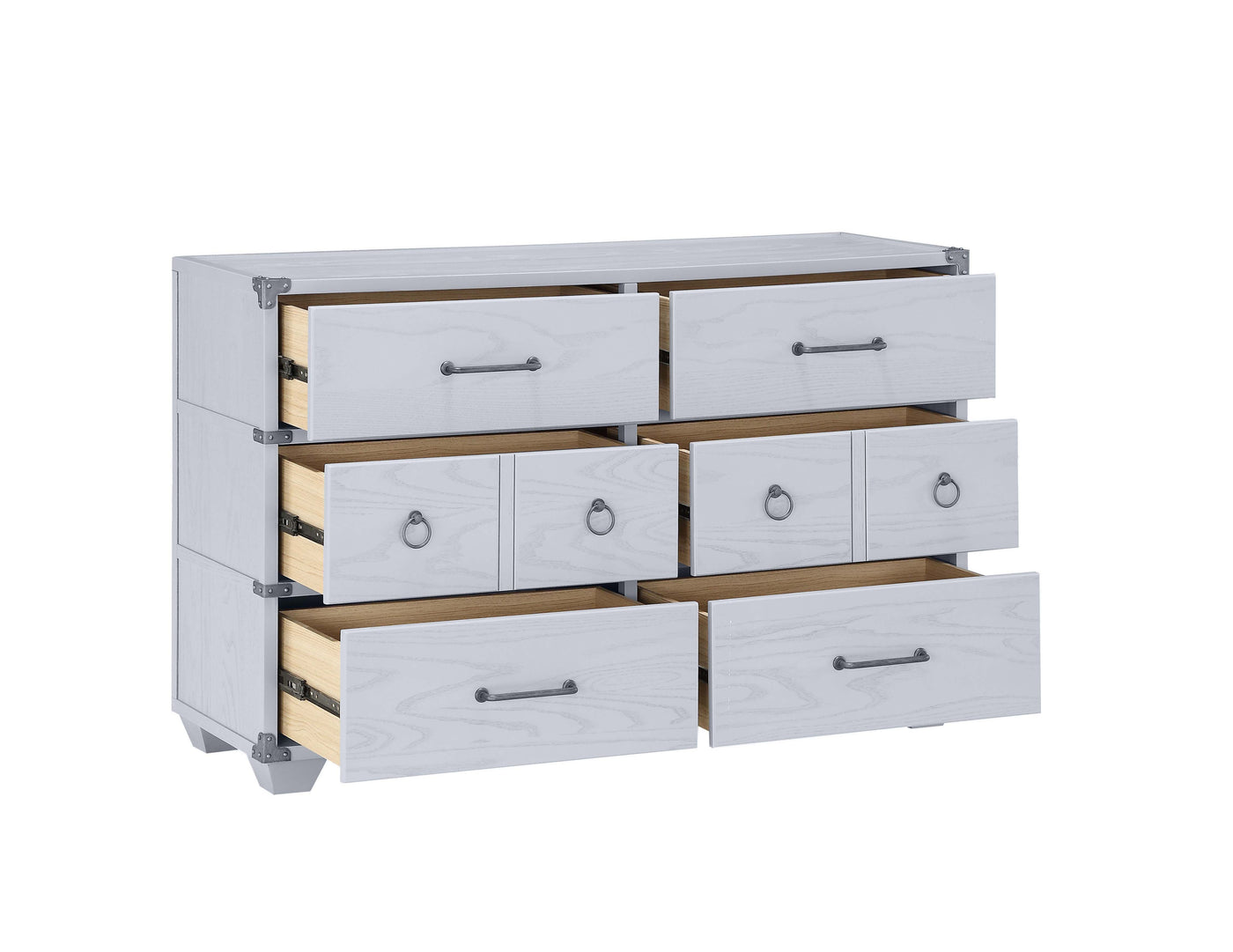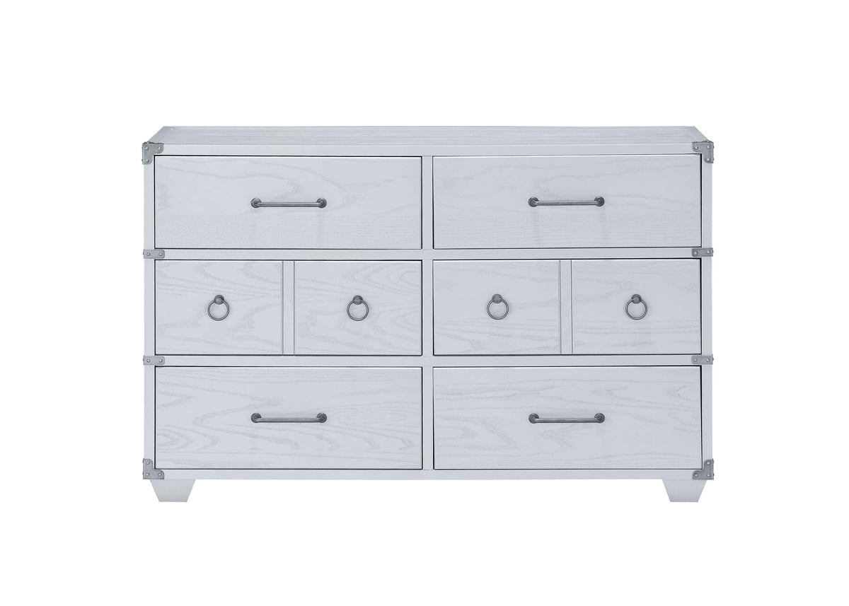 This dresser has a transitional look and blends in easily with any decor. The contemporary lines are highlighted by short, block legs, and metal handles and rings add character and value to this piece. The neutral, modern style makes it suitable for men’s and women’s bedrooms, providing plenty of storage space in this attractive piece of furniture.