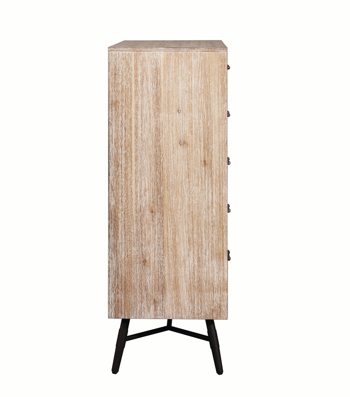 Five soft, felt-lined drawers make this wooden bedroom chest ideal for storing even the most delicate pieces. With plenty of space for an extended wardrobe, it's a fabulous addition to any bedroom in your home. Its planked drawer fronts are pleasingly accentuated by multiple finishing techniques for a natural, rustic look. Matte black metal legs and hardware give it an edge of industrial appeal. Pair this five-drawer chest with a matching bed, dresser, mirror, and nightstand to give any bedroom a cool, retro feel.