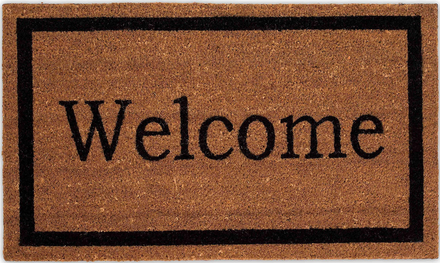 Enhance your entryway with the BIRDROCK HOME Welcome Coir Doormat. This durable, heavy-duty mat is perfect for indoor and outdoor use, designed to keep your home clean by trapping dirt, mud, and moisture. Made from robust natural coir with a vinyl backing, it provides a non-slip grip and withstands heavy foot traffic. Ideal for your front door, porch, garage, or backdoor, this doormat features a stylish black border and a natural fade, seamlessly complementing any exterior. Easy to maintain—simply shake, sweep, or vacuum to keep it looking fresh.