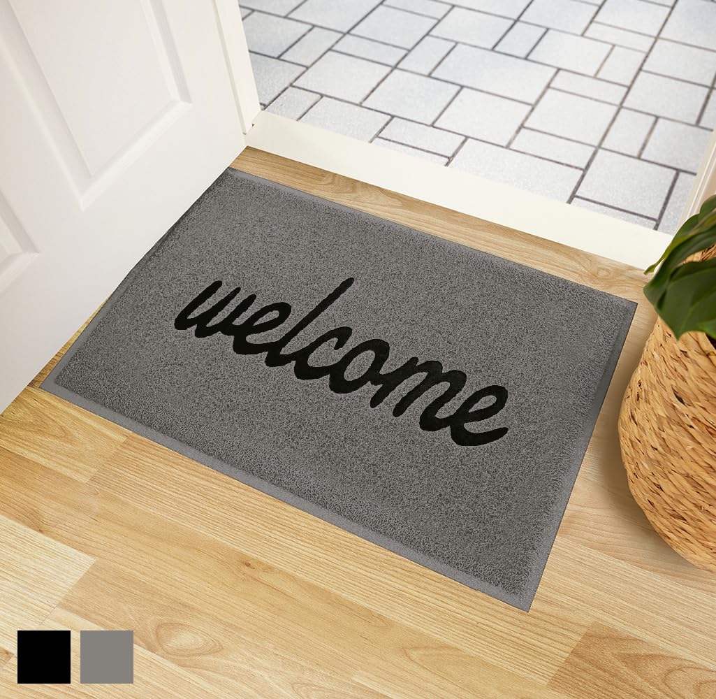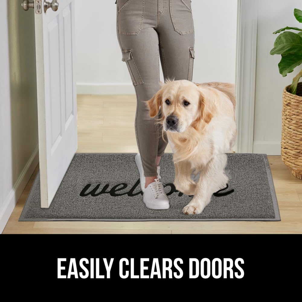 Gorilla Grip 100% Water Resistant All Weather Hello Door Mat, Dirt Grabber Mesh Welcome Doormat, Stain And Fade Resistant, Low Profile Entryway Mats For Home Front Or Back Entrance, 30X17 Gray/Black