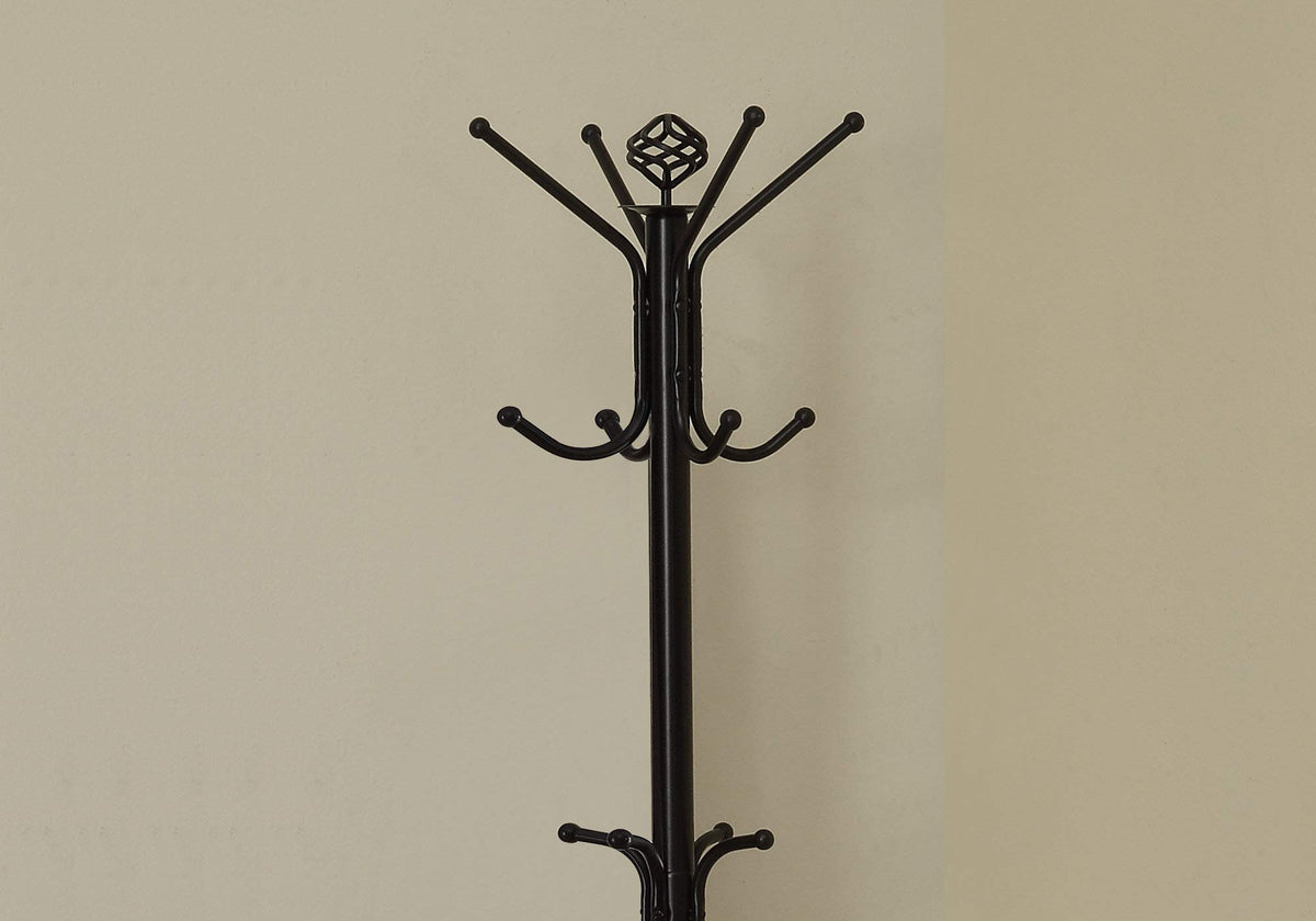 Black Metal Coat Rack Give guests a warm welcome when you place this contemporary style metal coat rack in your hall or entryway or make the most of a compact space by tucking one into a corner of your entryway bedroom mudroom or home office The smooth black finish with a round filial on top features a total of 12 hooks on a double tier enhancing the functionality of any space and keeps everyday items like coats scarves hats and jackets neatly in place Specifications. Color Black. Size 70 in. Material Metal. Weight 8 lbs