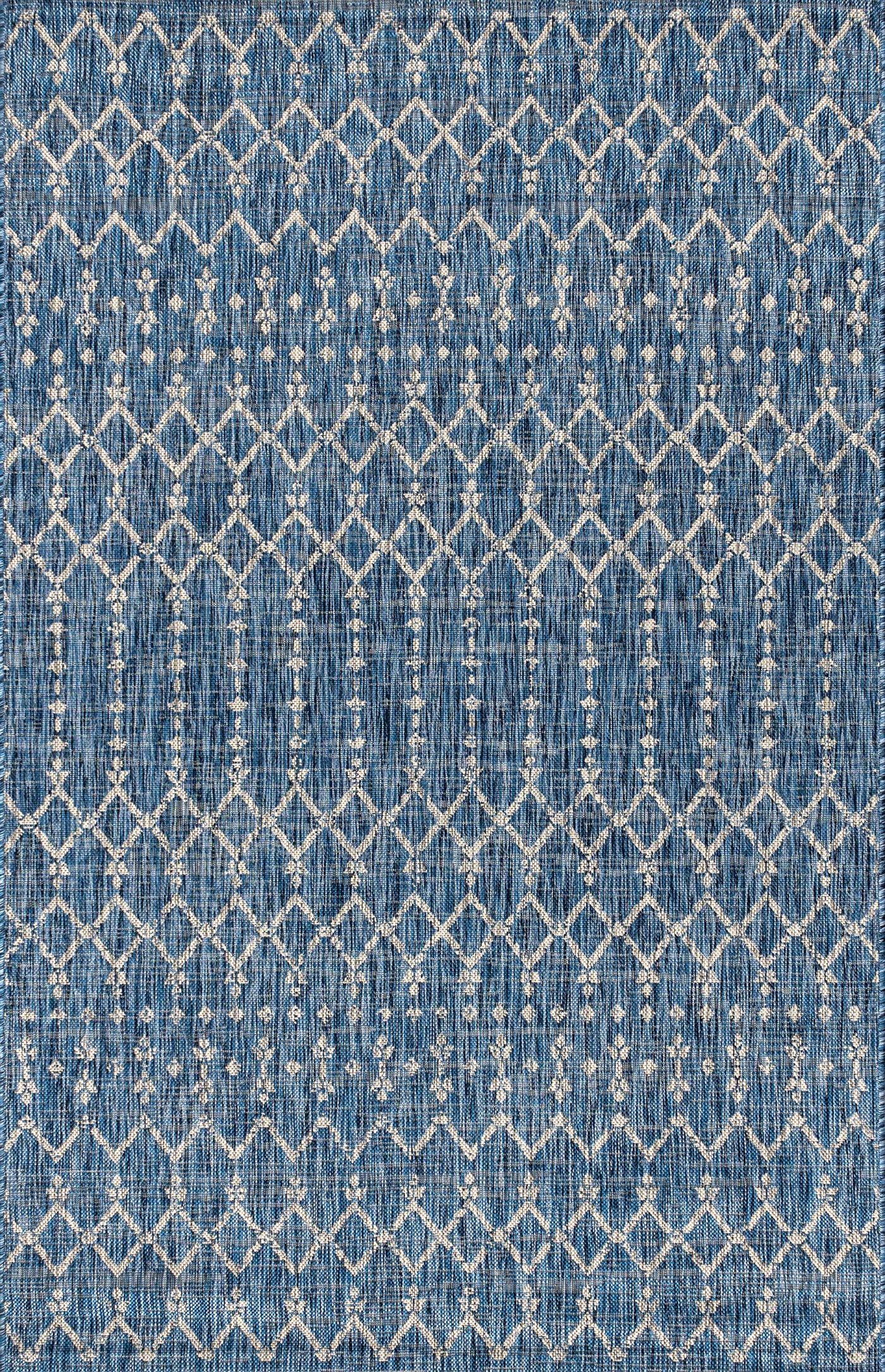 With its geometric design inspired by Moroccan tribal patterns, Our boho-chic rug adds eclectic style to an outdoor porch or patio. Varied tones of deep blues mingled with a light gray pattern give this rug a hand-woven, vintage vibe. The flatweave design is great for high-traffic spaces indoors too.