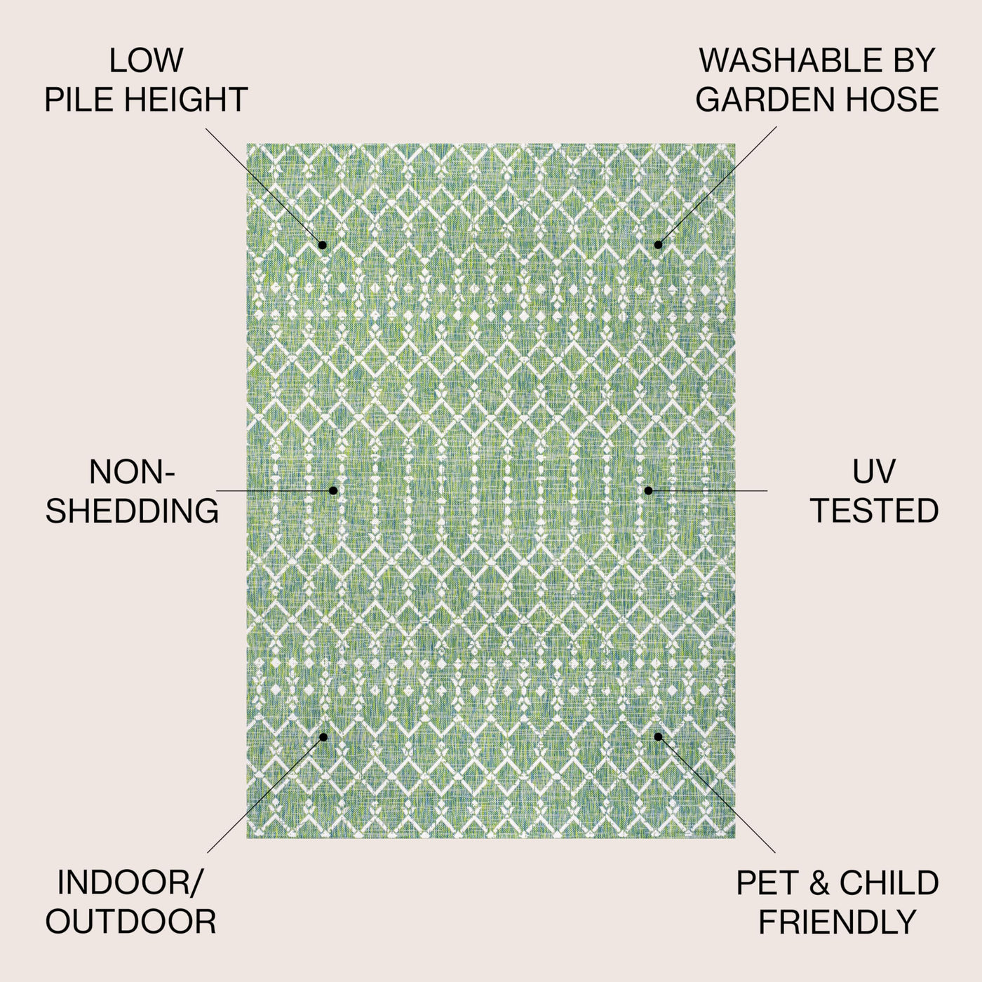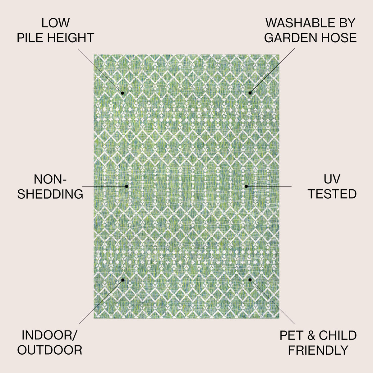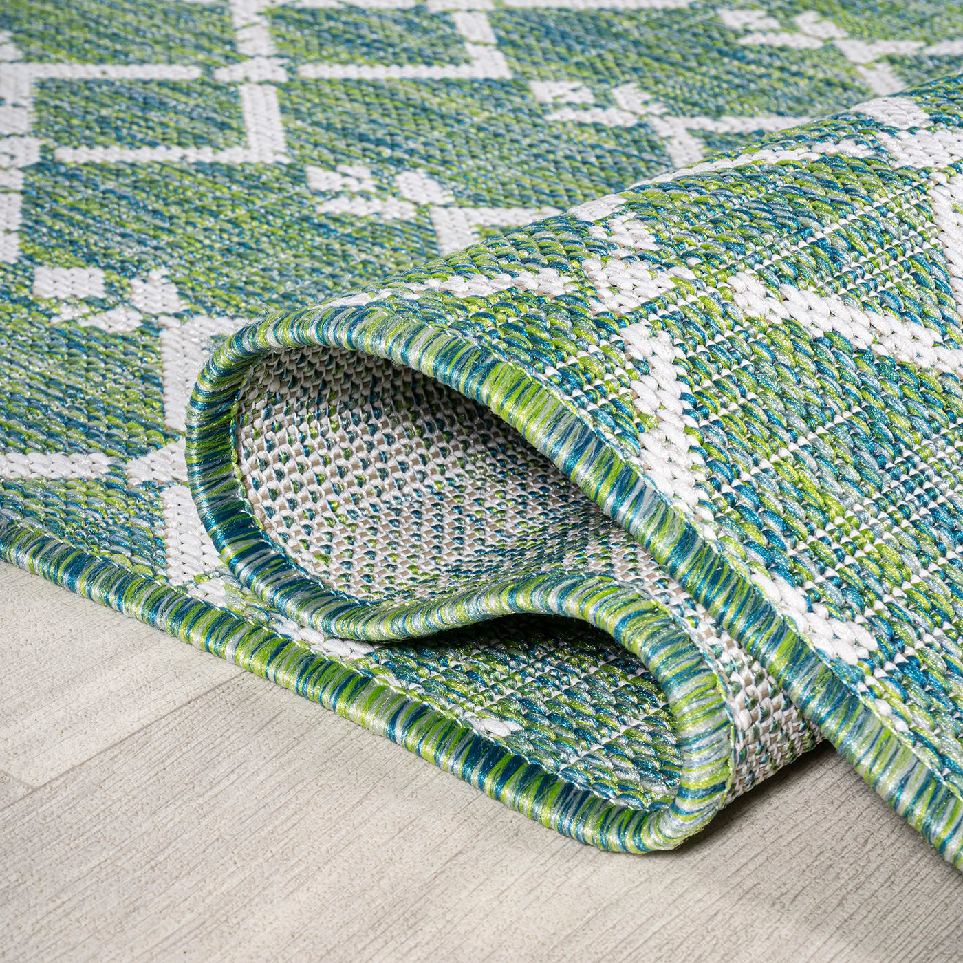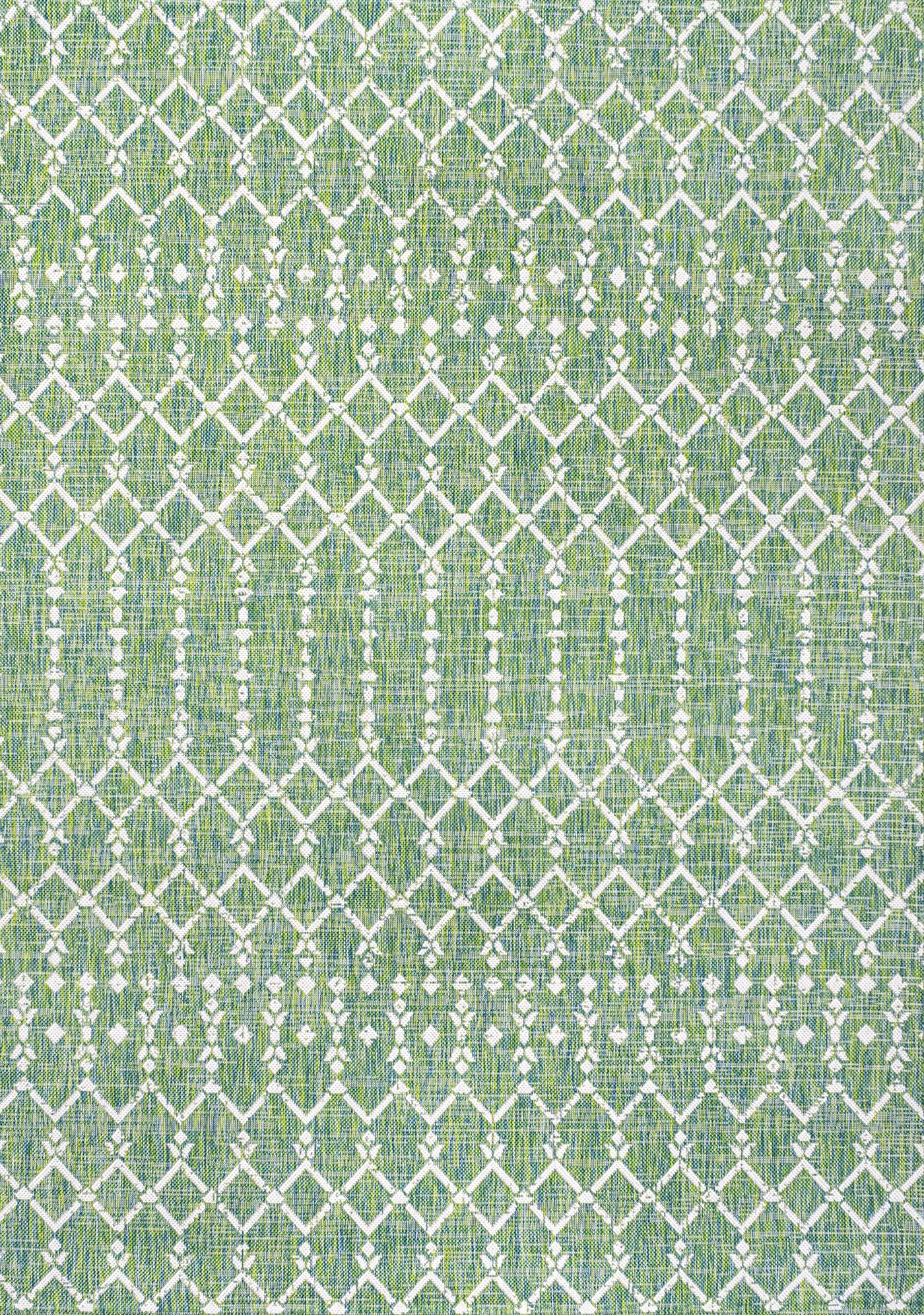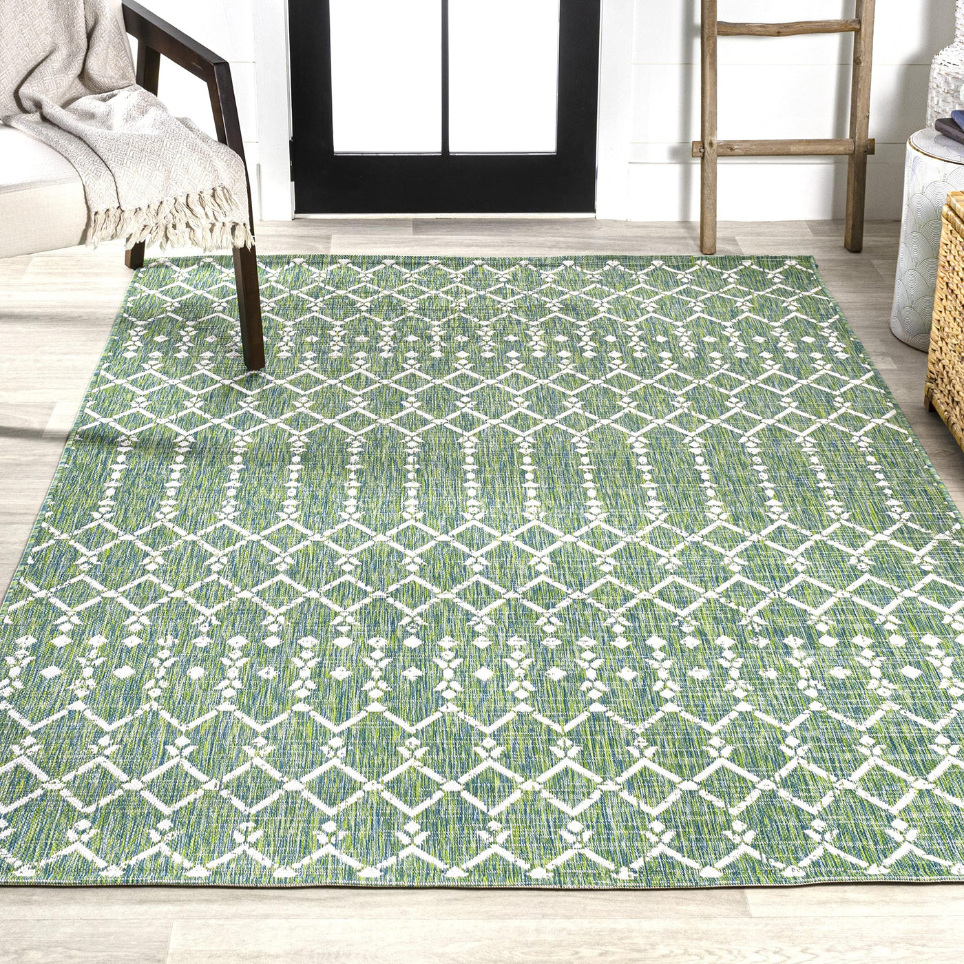 With its geometric design inspired by Moroccan tribal patterns, our Boho-chic rug adds eclectic style to an outdoor porch or patio. Varied tones of green mingled with a cream pattern give this rug a hand-woven, vintage vibe. The flatweave design is great for high-traffic spaces indoors too.