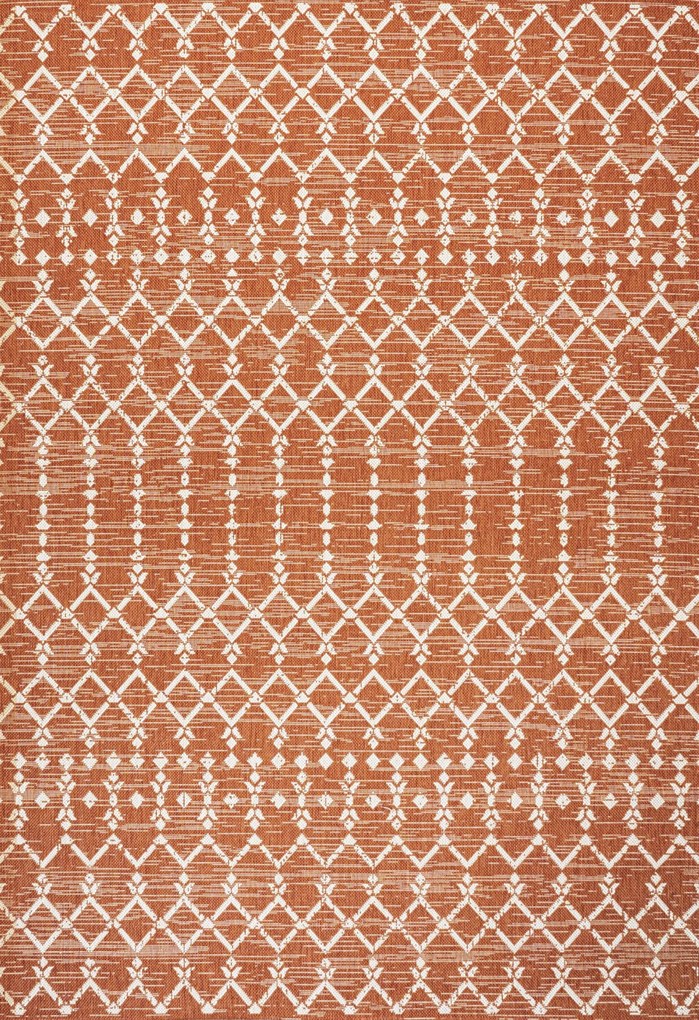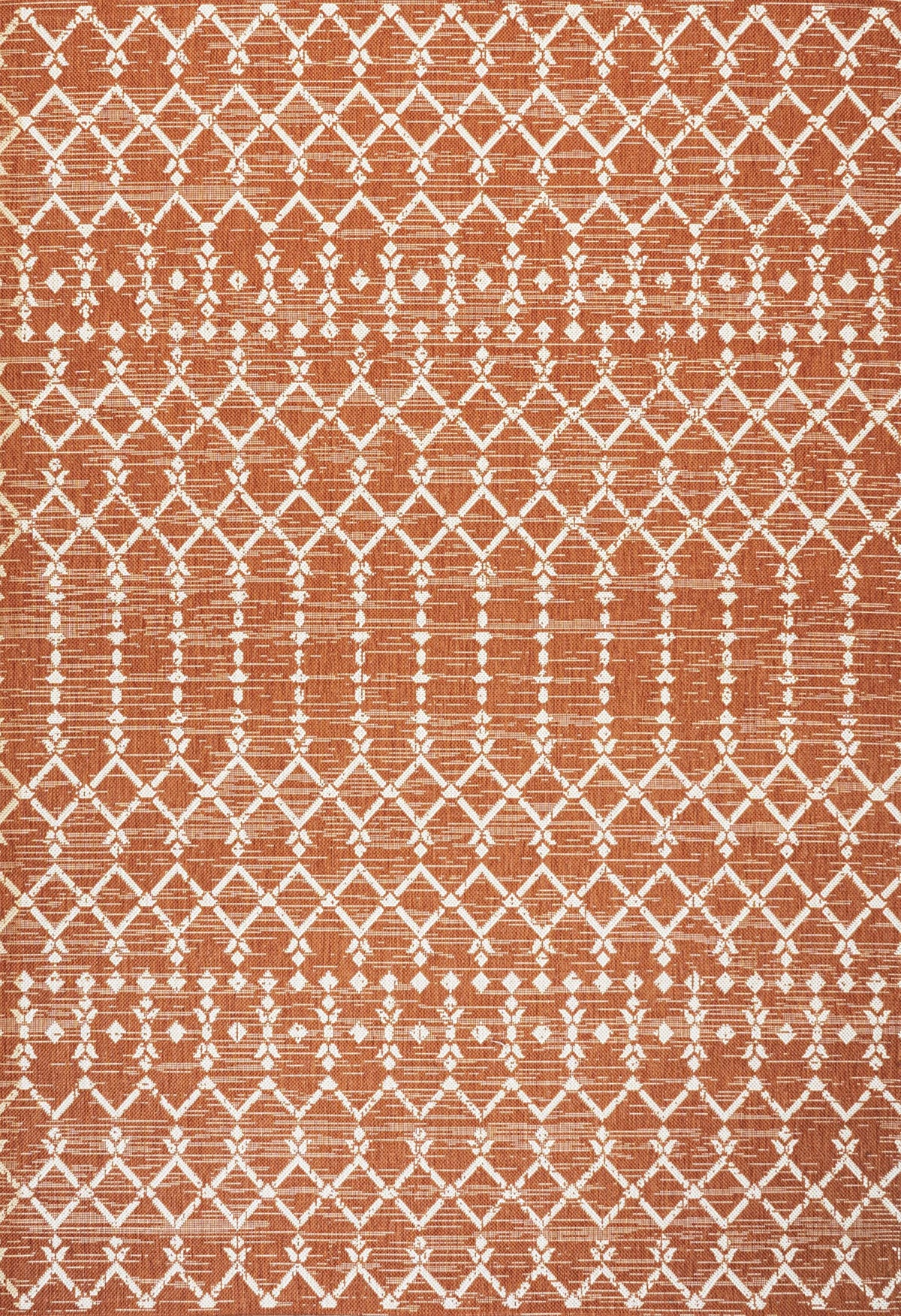With its geometric design inspired by Moroccan tribal patterns, our Boho-chic rug adds eclectic style to an outdoor porch or patio. Varied tones of orange mingled with a cream pattern give this rug a hand-woven, vintage vibe. The flatweave design is great for high-traffic spaces indoors too.