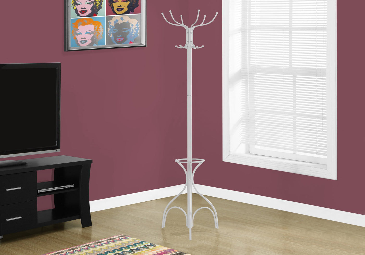 Monarch Specialties 2030, Hall Tree, Free Standing, 12 Hooks, Entryway, Umbrella Holder, Bedroom, Metal, White, Contemporary, Modern Coat Rack, 18" L x 18" W x 70" H