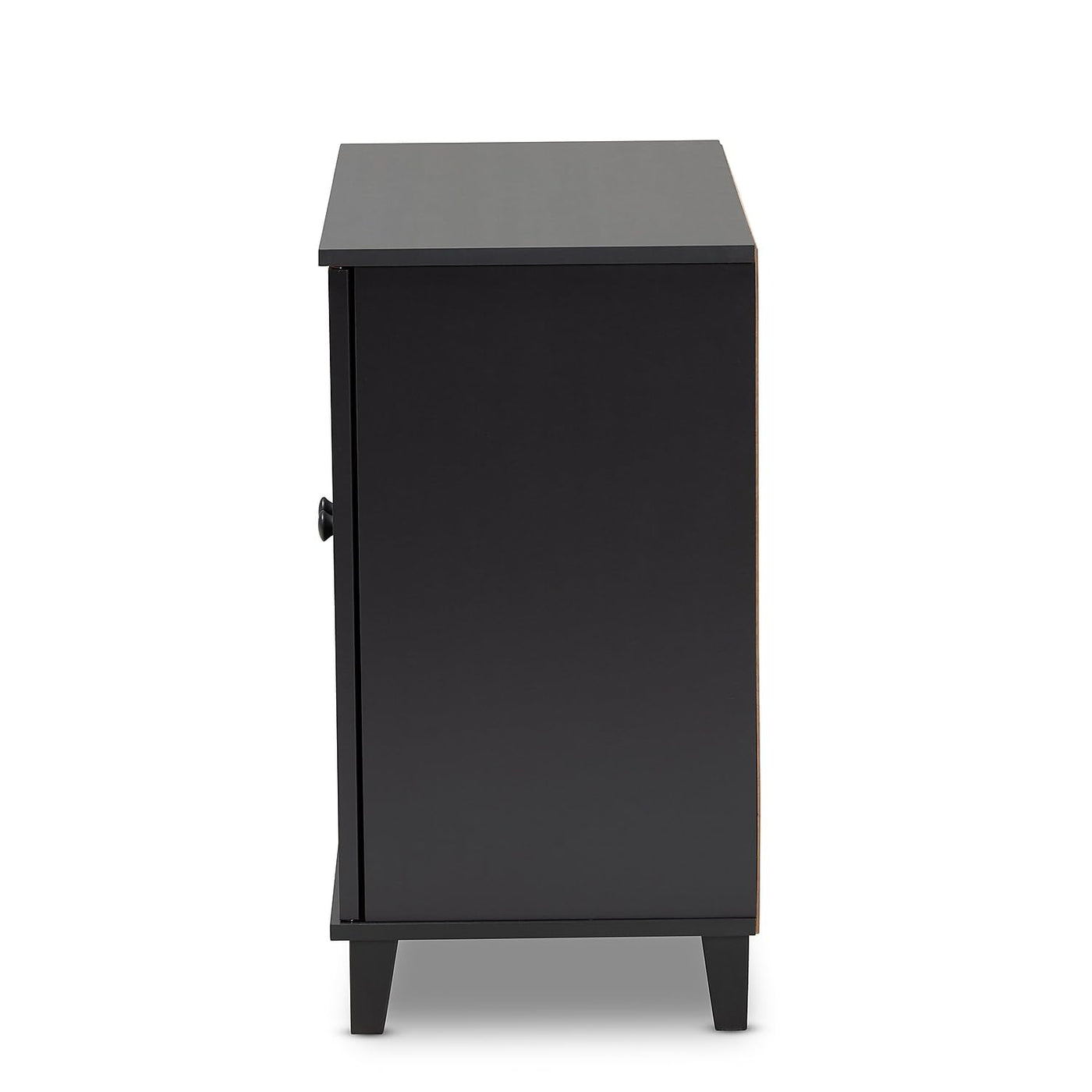 - Modern And Contemporary Shoe Storage Cabinet. - Constructed From Engineered Wood With Polyurethane Veneer. - Dark Grey Finish. - Four (4) Shelves Provide Storage Space For 12 Pairs Of Shoes. - Magnetic Door Closure. - Tapered Legs. - Assembly Required. - Dimensions: 28" High X 29.5" Wide X 15" Deep; Shelves: 5.1" High X 27.6" Wide X 11" Deep; Legs: 3.5" High.