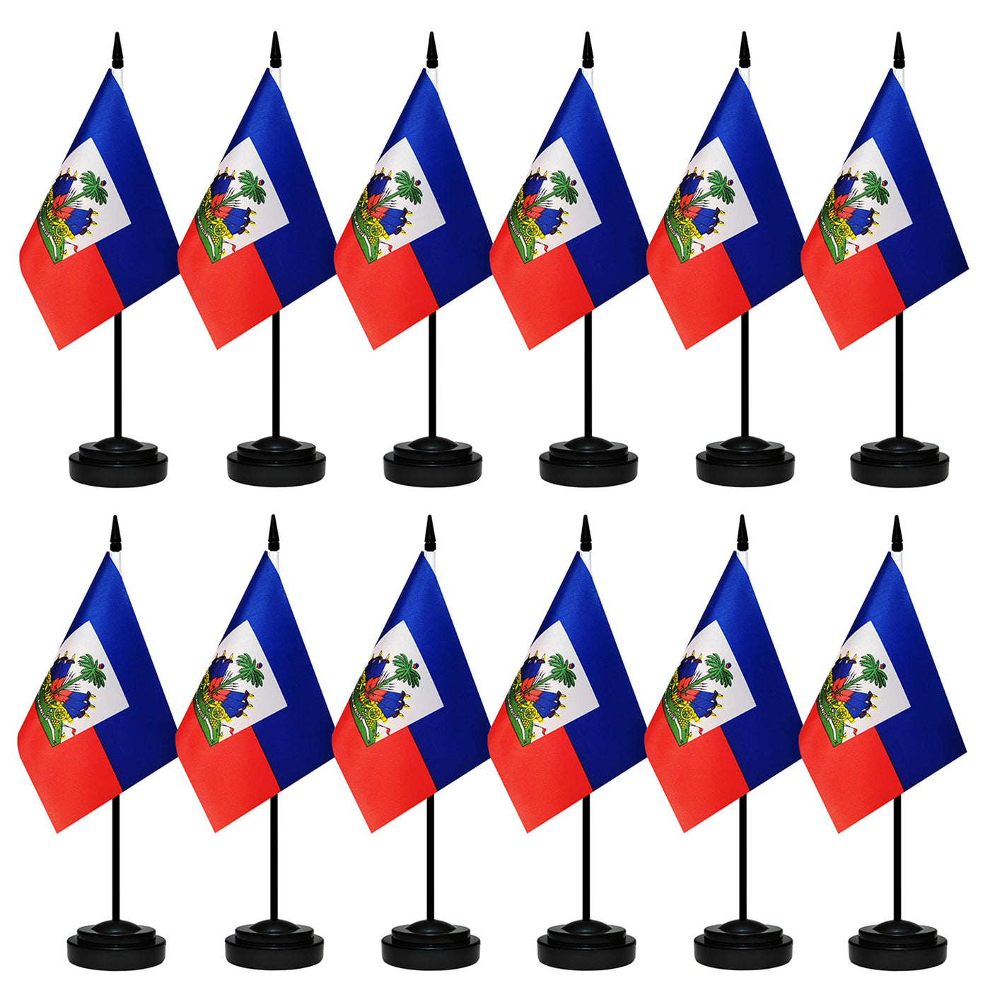 12 Pack Haiti Desk Flags Set, Haitian Small Mini Table Office Flags With 12' Solid Black Pole, Black Base And Spear Top, Miniat