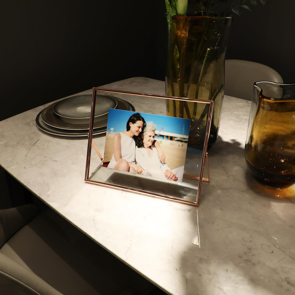 Q: What materials is the AhaGo photo frame made from?A: The AhaGo Rose Gold Floating Frame features a high-quality metal frame and double-sided genuine glass panels, ensuring durability and an elegant display for your cherished memories.