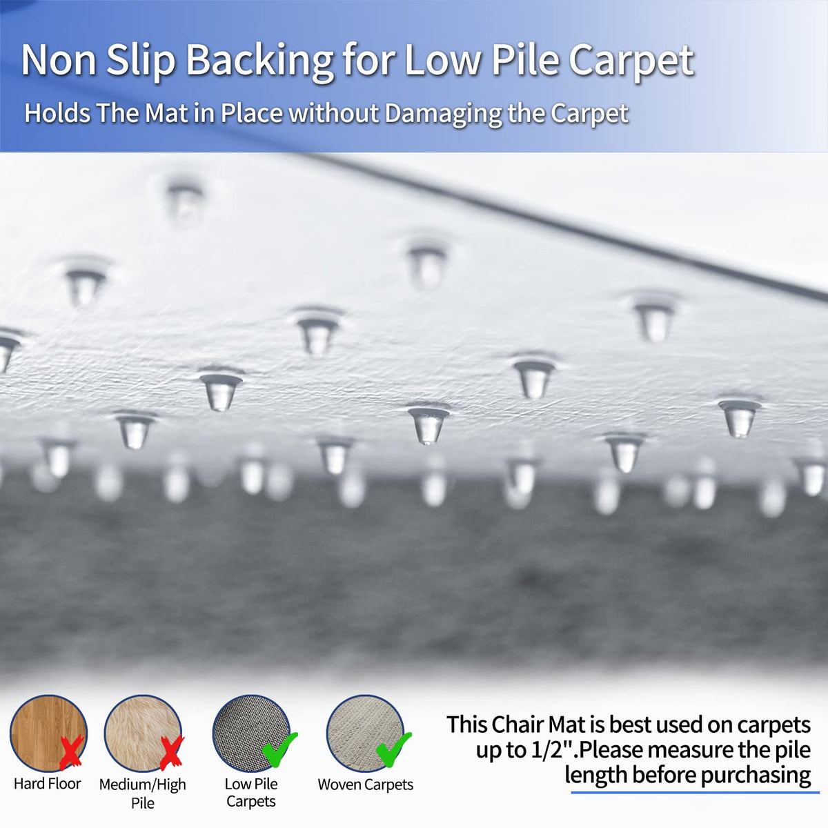 Features: Protect Low Pile Carpet: Amyracel Carpet Protector For Desk Chair Is Ideal For Your Home Or Office To Protect Your Low Pile Or Flat Pile Carpet From Everyday Wear And Tear Caused By Chair Legs And Rolling Casters. Easy To Clean: Just Wipe The Plastic Chair Mat For Carpet With A Damp Cloth And No Chemicals Needed For Best Results. Transparent: The Chair Floor Mat Allows The Beauty Of Your Carpet Floor To Shine Through. Blends Seamlessly With Your Carpet Floors. Sturdy And Durable: 2.2Mm Much Thicker. Strong And Sturdy For Long-Lasting Use. No Dents Or Cracking Even Under High Stresses On This Office Mats For Rolling Chairs. Safe & Eco-Friendly: The Office Floor Mat Is Odorless, Free From Toxins And 100% Recyclable. Child And Pet Safe. Effective Grip: The Plastic Floor Mat For Office Chair Is Designed With Studded Backing To Hold It Firmly In Place On Low Pile Carpet Floors Up To 1/4” (0. 25”) Thick. Easy Glide & Anti-Skid: Amyracel Rolling Chair Mat Provide Wear Resistance And A Smooth Textured Surface That Allows For Easy Chair Movement Without Skidding. No Curved-Up Edges: Our Carpet Mat For Office Chair Won’T Bend, Which Means No Curved-Up Edges.