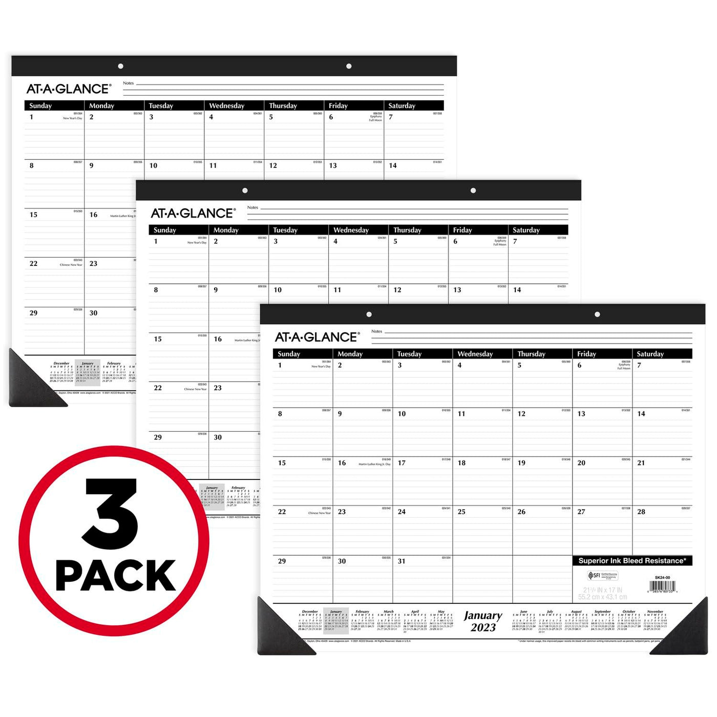 Monthly Desk Pad Calendar Helps Protect Your Desktop And Serves As A Perfect Resource For All Your Planning Needs. Keep Track Of Your Daily Schedule Including Appointments, Deadlines, Special Events And More. High-Quality Paper Features Superior Ink Bleed Resistance. The 12 Month Calendar Covers January 2023 - December 2023 With One Month Per Page For Easy Referencing Of Dates. The Large, Ruled Blocks Allow You To Take Notes And Track Appointments And Monthly Goals On This Professional Desk Pad. Block Size: 2-15/16' X 2-3/8'. Extra Lined Notes Space Is Also Included. A Full Calendar Year Is Printed At The Bottom Of Each Page For Future Planning And Fast Date Reference. Monthly Calendar Pages Are Perforated For A Clean And Easy Tear Off At The End Of Each Month. This Desk Pad Is Printed In Black On White Paper With A Wide Black Top Binding. The Binding Is Punched With Eyelets So That The Desk Pad Can Also Serve As A Wall Calendar. Two Black Poly Corners Keep Pages Flat For Hanging Or Desktop Use. Page Size 21-3/4' X 17'. Pack Of 3.