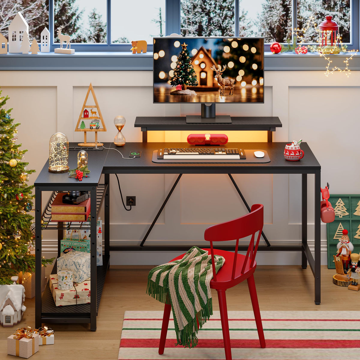 Bestier 58 L Shaped Gaming Desk With Led Lights & Power Outlets,Reversible Home Office Corner Desk With Shelves,Larger Pc Workstation With Hooks For Studying,Desk For Bedroom,Carbon Fiber Black