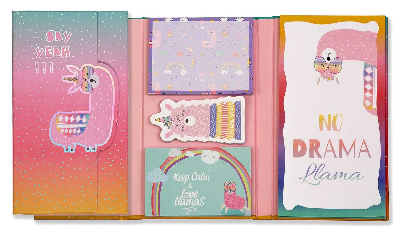Better Office Products Compact Assorted Sticky Notes Book Is A Folding, Padded Cover Book Of 4 Different Designs In Fun Designs Relating To No Drama Llama. The Folded Book Measures 6.4' X 3.6' X 0.4'.
