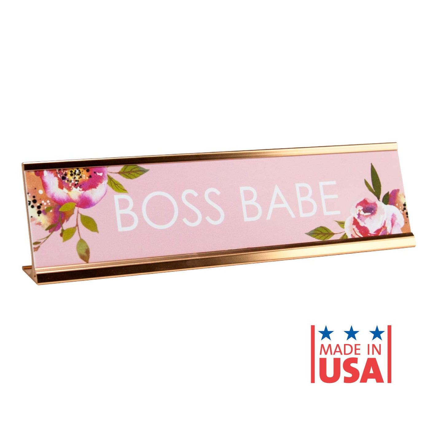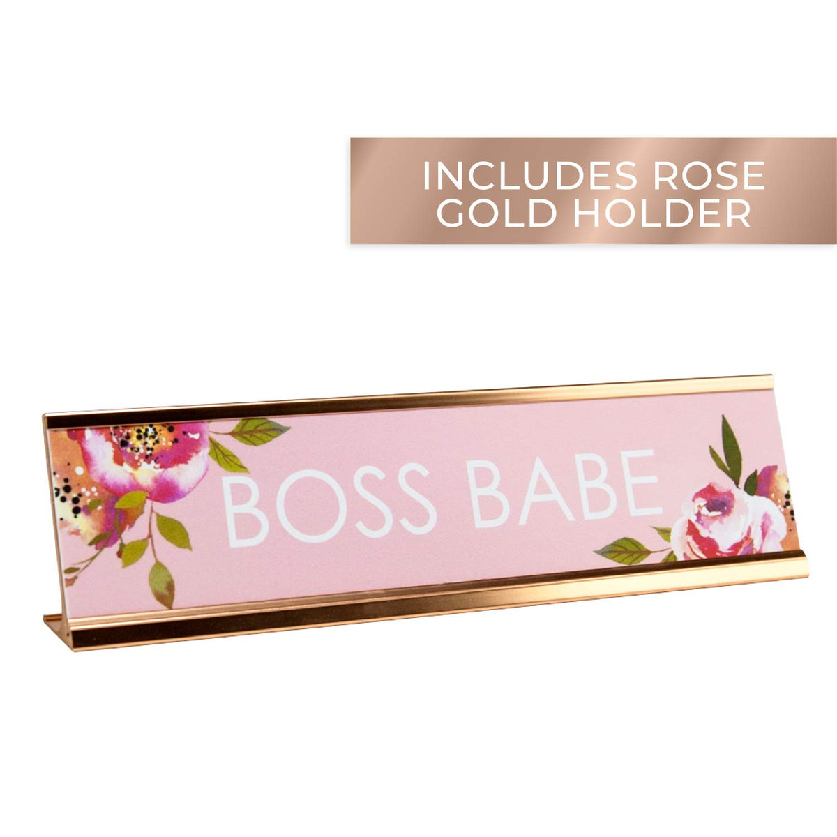 Q: What makes the Boss Babe Desk Plate unique?A: The Boss Babe Desk Plate features a unique, bright floral design that isn't found anywhere else, combined with a matching rose gold holder that adds a stylish touch to any workspace.