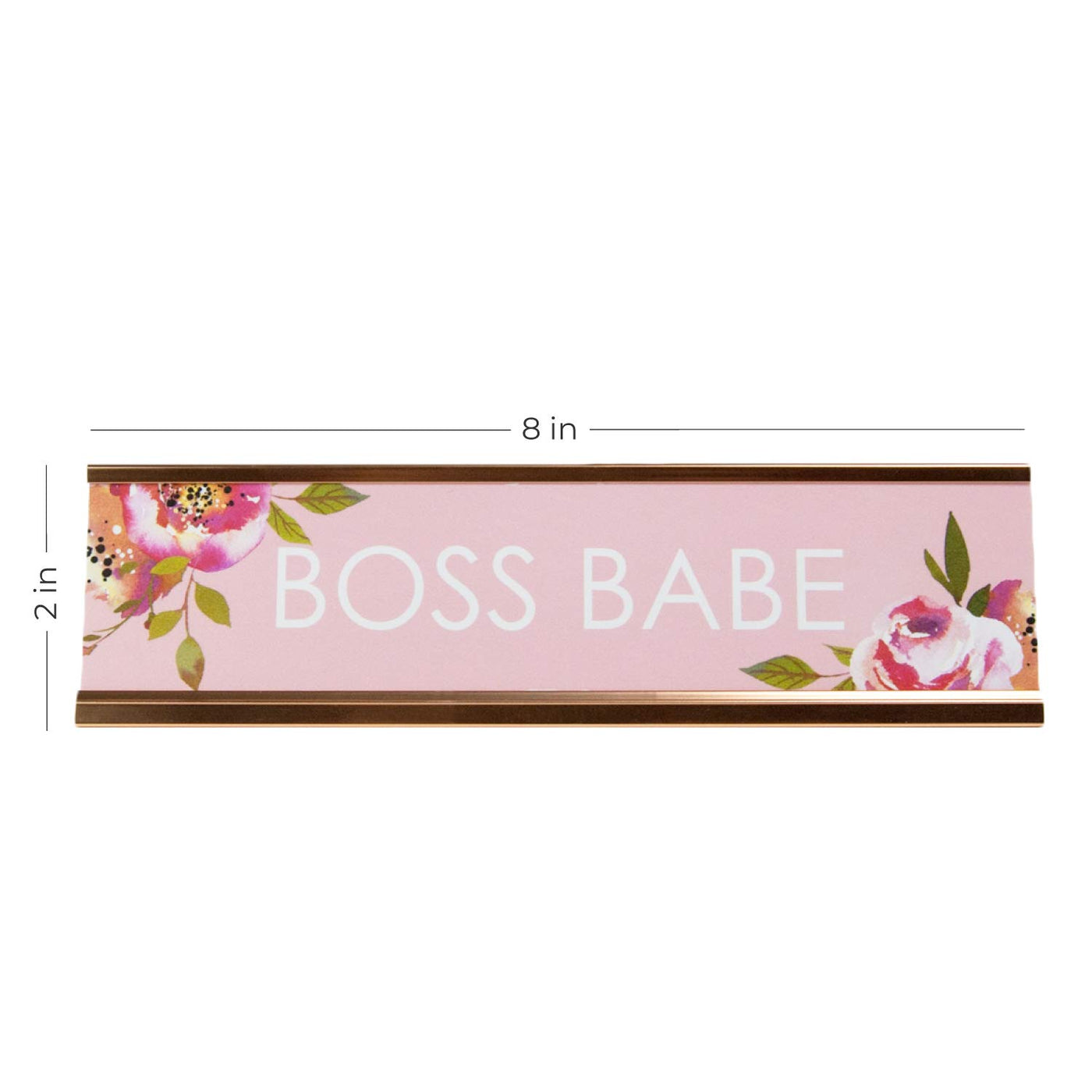 Q: What are the dimensions of the Boss Babe Desk Plate?A: The Boss Babe Desk Plate measures 2 inches by 8 inches, making it a convenient size that easily fits in with your other desk décor.