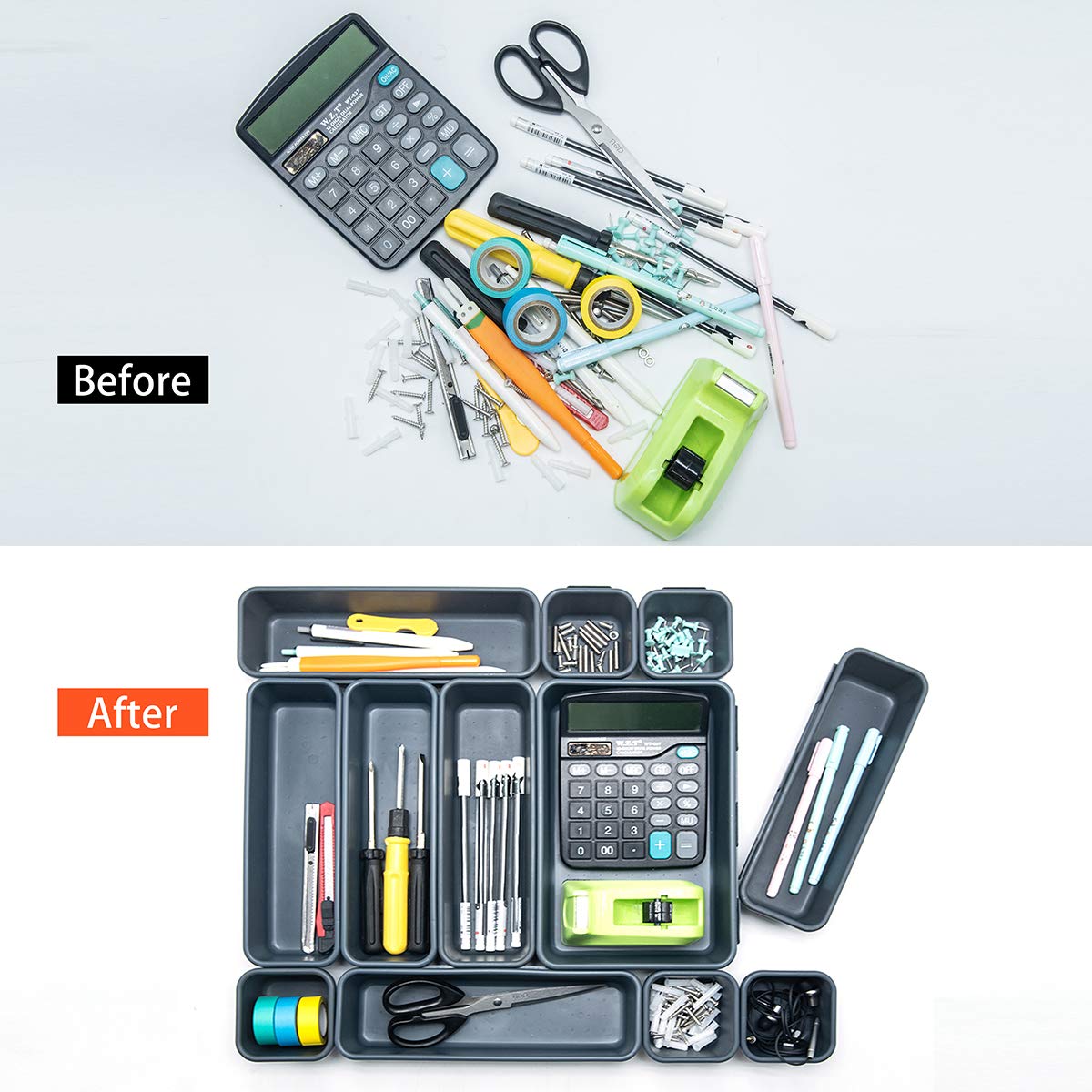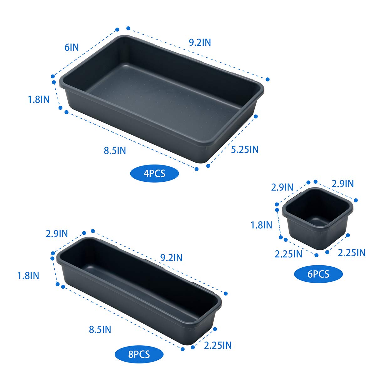 Bycy- Be Yourself, Create Better Life.Dark Grey Drawer Organizers 18 Pieces Per Set. For Drawer Organizer, Organizer Your Life, Not Only In Makeup Drawer, Can Put Them In Every Kind Occasion, Such As Kitchen Drawer, Office Desk. Make Every Look More Neat And Organized. Great Help In Your Home And Office. Drawer Organizer Bin Pack | Unique Design. 1. Features: For Each Size Drawer Organizer, There Is Design To Keep Every Drawer Organizer Bin Neat And Lock Together. Make Every Stuff Aligned In The Drawer To Find Easily. 2.Non Slip Line In The Bottom:When You Open Your Desk Drawer / Makeup Drawer, You Will Find Every Drawer Organizer Bin Keep In The Same Place. 3. Rounded Corner:Easy To Clean Your Drawer And Fit For Any Kind Drawer Corner. Smooth Edge Prevent Any Cutting Feeling Causing. How To Use | Where To Use. 1.Fit For Any Occasion: Bpa Free Material, You Can Put Anywhere You Need, Such Drawer, Bathroom, Bedroom, Kitchen,Even In Refrigerator. 2.Suitable Size:Each Size Can Meet Your Organization Need. A.3 * 3 : You Can Use This Size To Put Paper Clips, Sticky Notes, And Push Pins Stay Sorted And Are Easy To Locate In These Drawer Organizers. B. 9 * 3 : Great For Organize Toothbrushes, Toothpaste Eye-Shadow Palettes, Makeup Brushes, Pencils And Markers. C. 9 * 6 : Large Enough To Put Eye-Shadow Palettes, Calculator, Hair And Nail Supplies. Why Choose Us? As A Small Seller Amazon, Not Only Focus On Our Products And Sale, But Also Pay Attention To The Service We Provide To Customer. Each Kind Of Drawer Organizer Is Designed With Heart, Every Set Is Designed To Meet Customer Needs. We Would Like To Help Everyone To Have A Organized And Neat Life In Their Home And Office. If You Have Organizer Needs, Choose Us To Give You Solution, We Will Give You A Surprise.