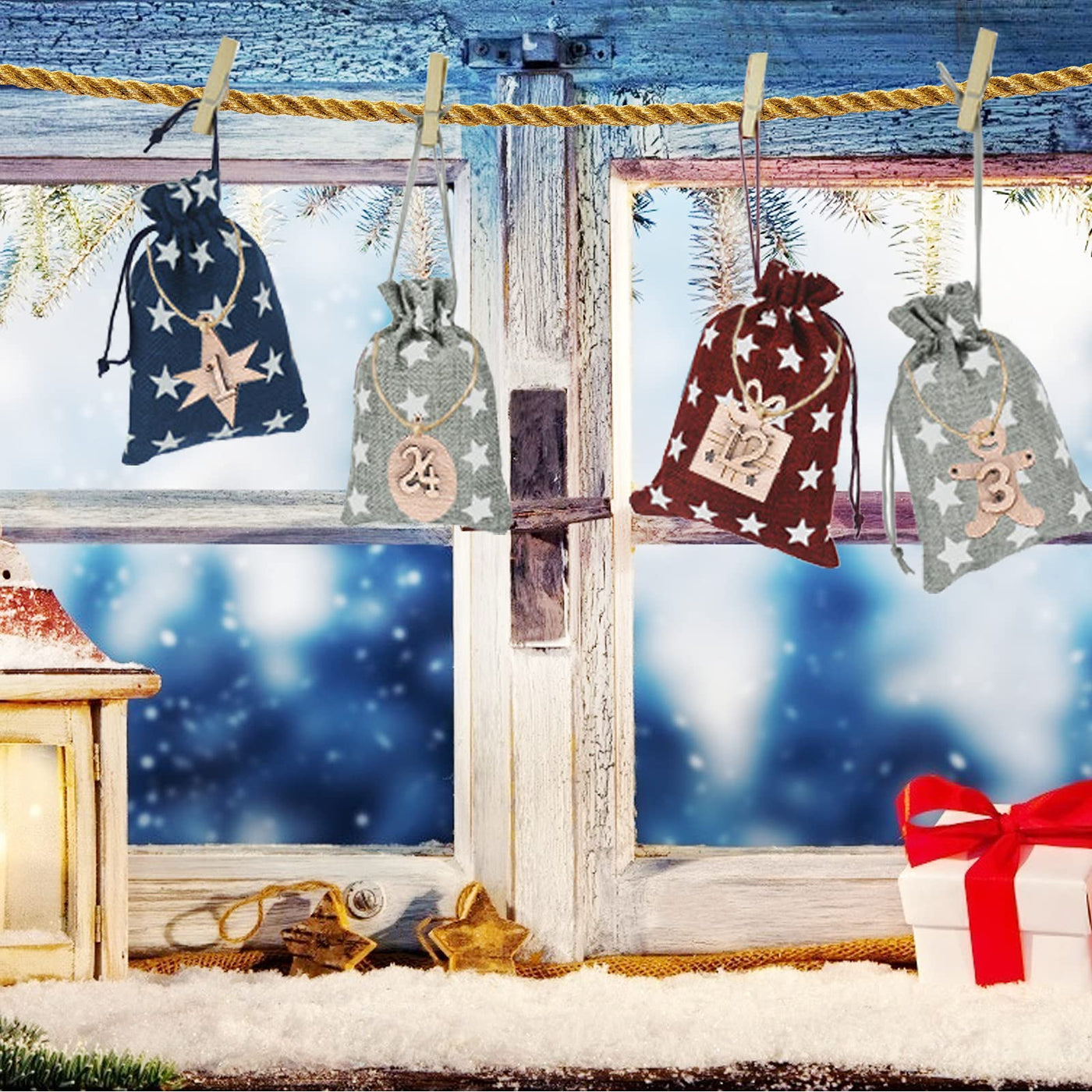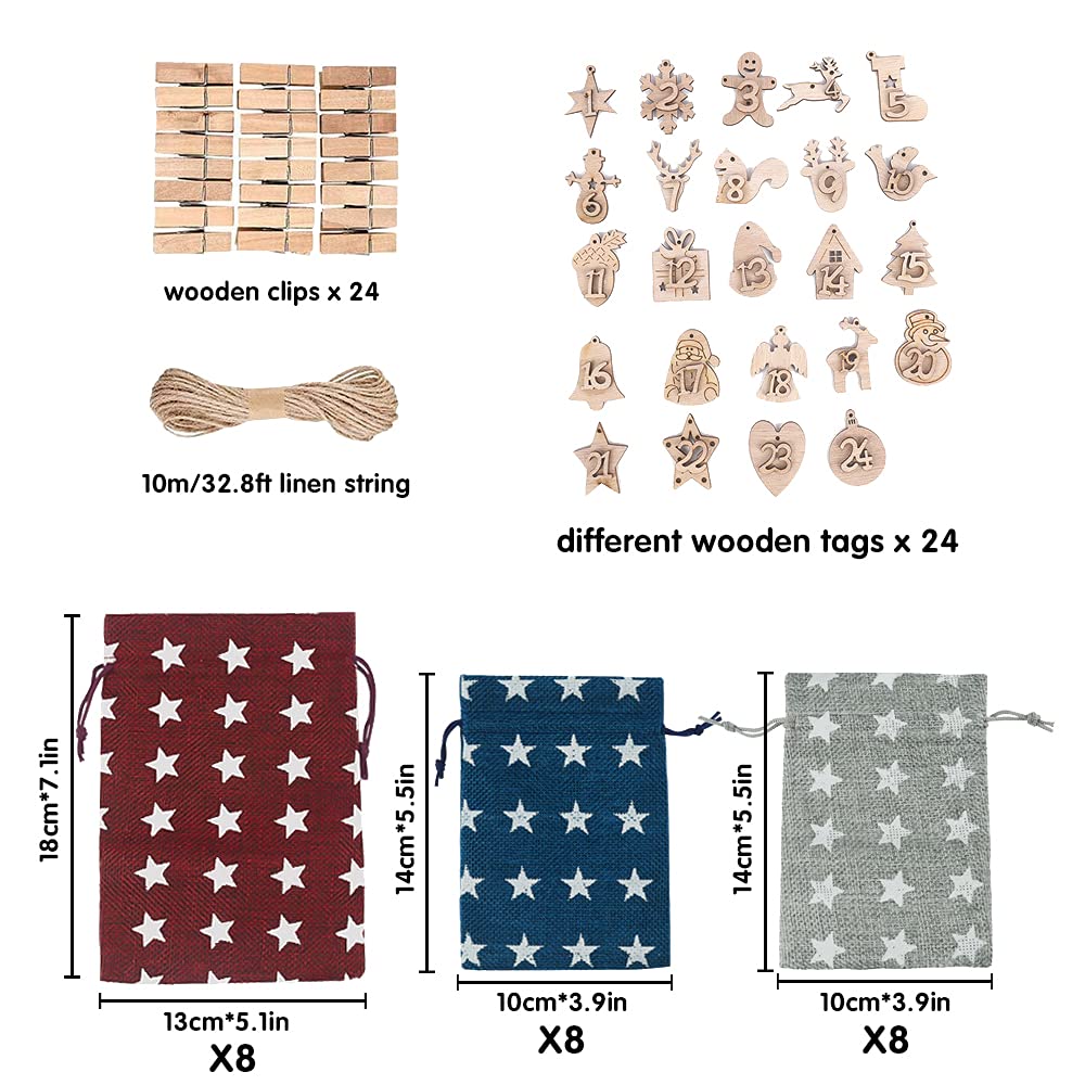 Q: What is included in the Christmas Advent Calendar set?A: The set includes 24 burlap bags, 24 wooden tags numbered from 1 to 24, 24 wooden clips, and a 10m/32.8ft long linen string to help you easily assemble and display your advent calendar.