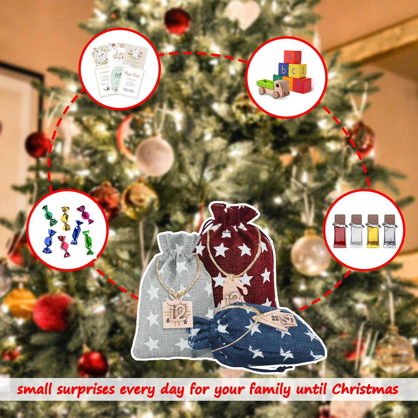 Q: What can I put in the Christmas Advent Calendar bags?A: You can fill the burlap gift pouches with a variety of small items such as candies, toys, or personal notes. Each bag can hold surprises that will delight your friends and family throughout the 24-day countdown to Christmas.
