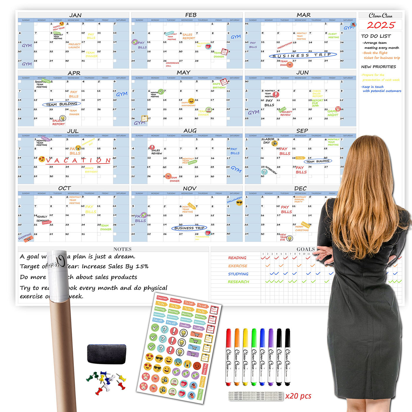 Clever Clean Large Dry Erase Wall Calendar - 48'X58' 12-Month 2025 Undated Yearly Calendar For Home, Office, School Projects -