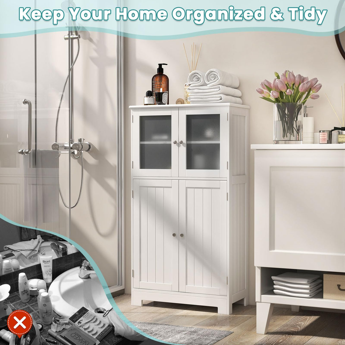 Description COSTWAY Bathroom Storage Cabinet - a must-have addition to elevate your bathroom organization and enhance your daily routine. Our floor cabinet offers an abundance of storage options to alleviate clutter and keep your bathroom essentials conveniently accessible. Multiple shelves and compartments provide ample space for towels, toiletries, cleaning supplies, and more. Say goodbye to messy countertops and enjoy a tidier bathroom oasis. Designed to optimize space utilization, our storage cabinet makes the most of your bathroom's available area. Its compact design allows it to seamlessly fit your living room, bedroom, entryway and so on.