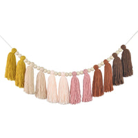 Q: What materials are used in the garland's construction?A: This garland is made from soft yarn with hand-tied tassels, complemented by natural wooden beads. This combination provides a perfect mix of texture, warmth, and handcrafted charm, suitable for cozy, kid-friendly environments.