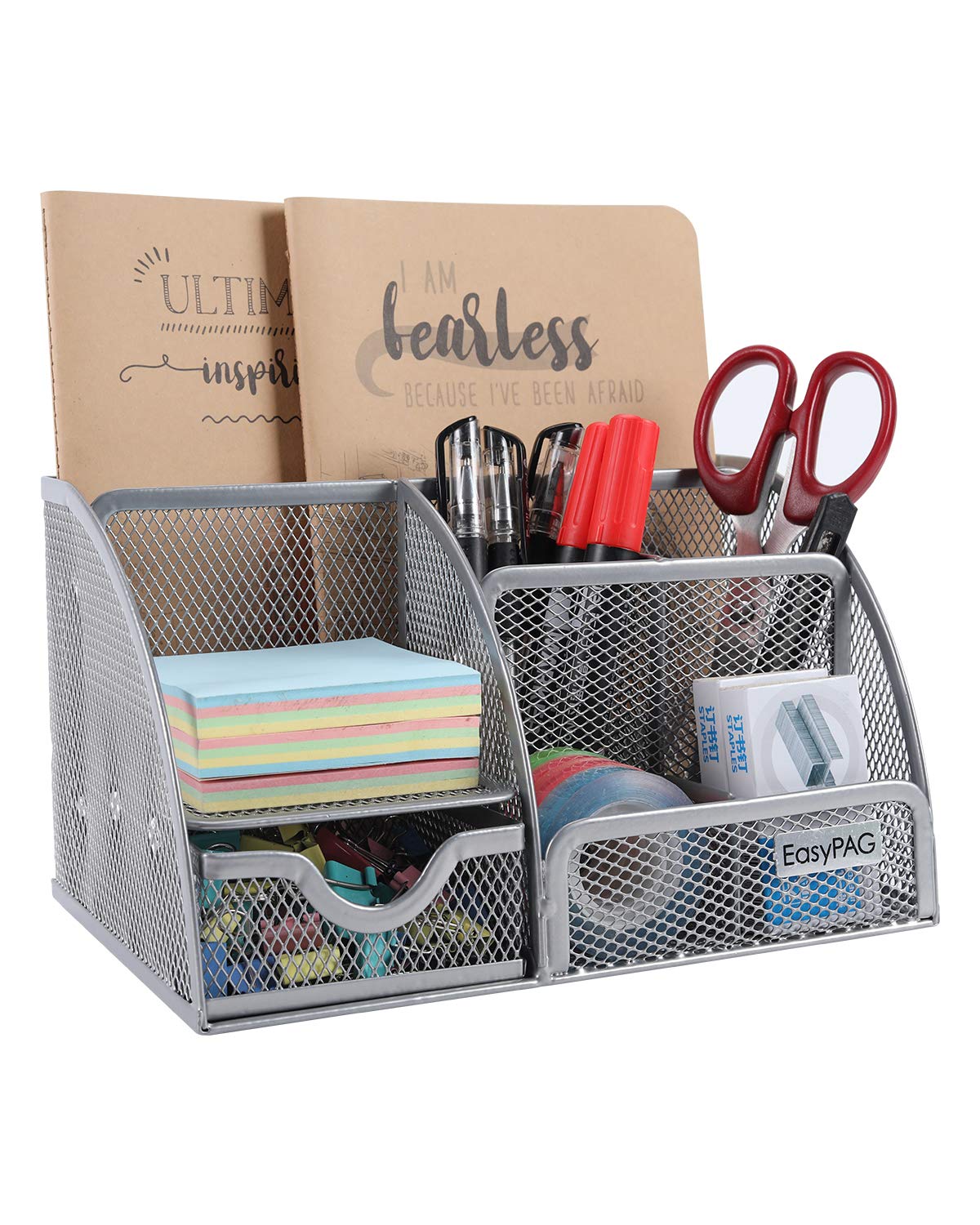 Easypag Mesh Desk Organizer Multi-Functional Office Supplies Stationery Caddy Pen Holder With 6 Compartments And 1 Drawer,Silver