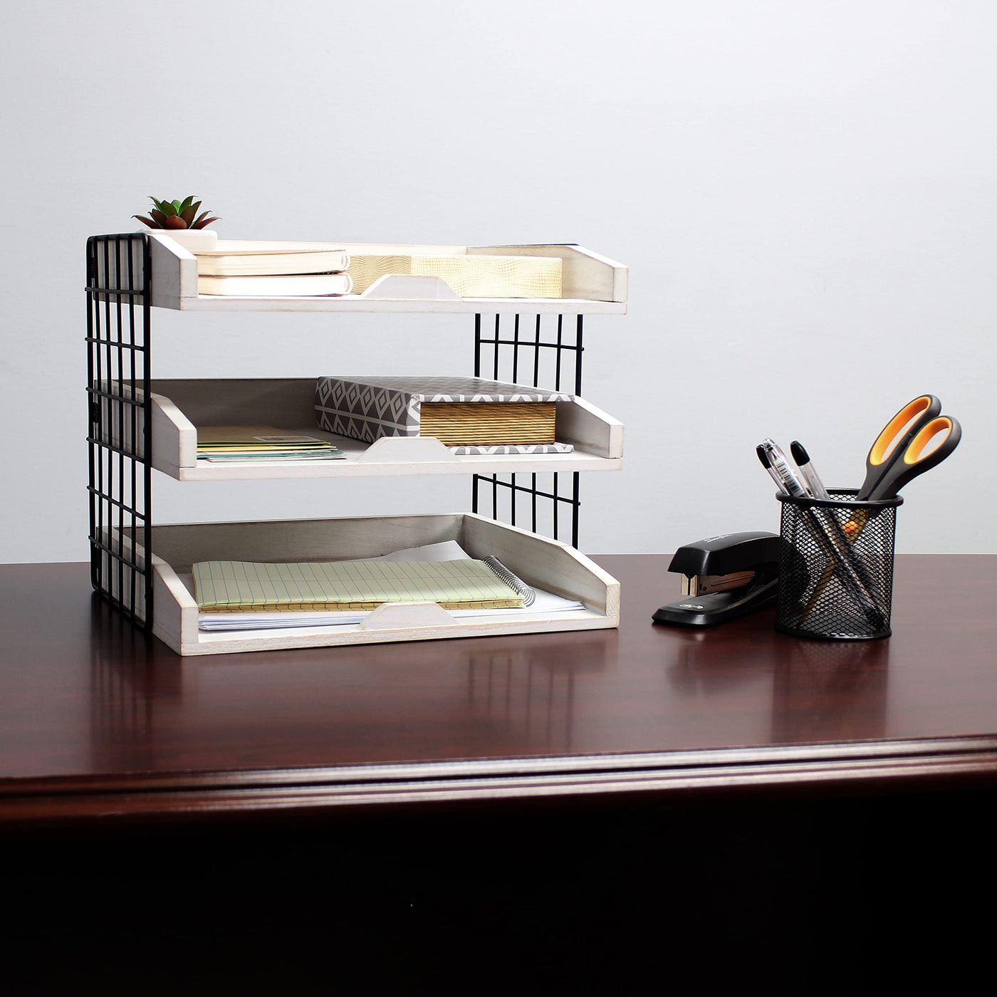 Perfect for storing your paper, notes, mail, folders or other documents in this charming desktop metal and wood organizer. It features 3 wooden trays accented with black metal accents. Each tray can hold standard 8.5x11 paper. Perfect to add a touch of rustic chic to your home office!
