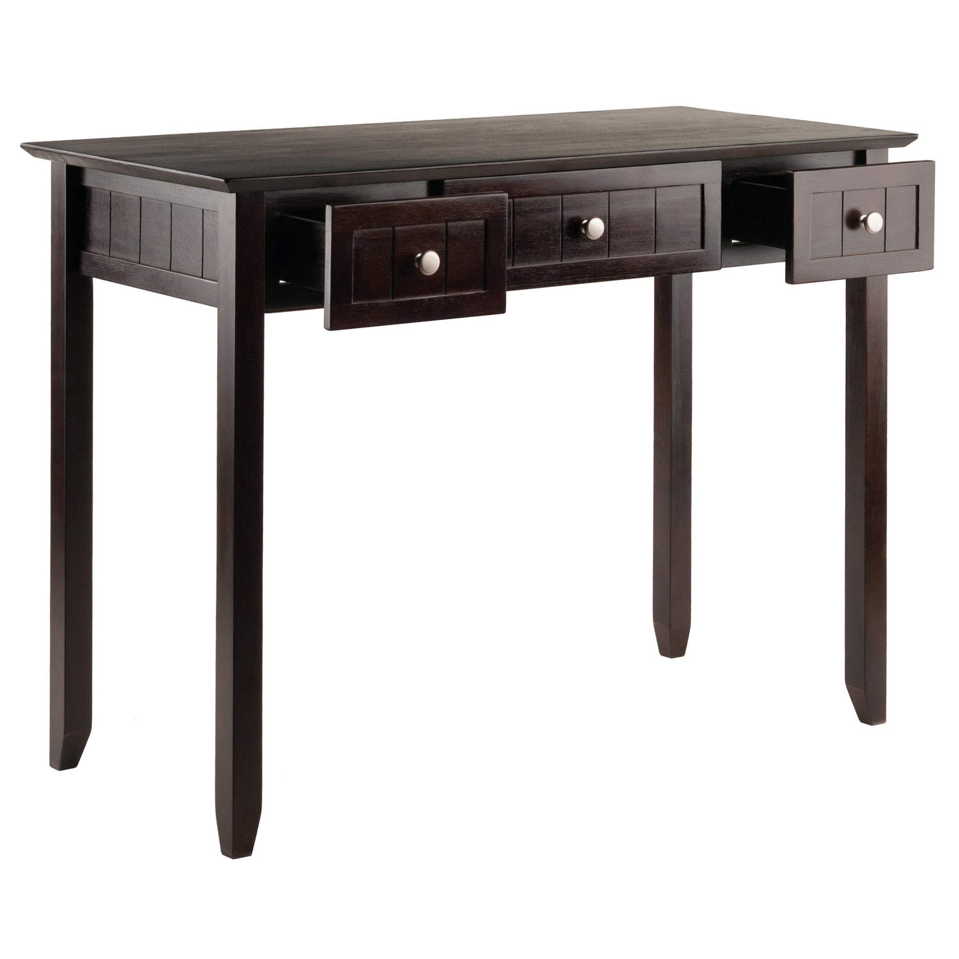 The Ergode Wood Burke Home Office Writing Desk features a charming cottage style that will enhance the ambiance of your home office. With its side and front wainscoting panels, beveled cabinet top, tapered legs, and brushed nickel knobs, this desk exudes a handsome and relaxed vibe. It offers a spacious desktop surface for various tasks and three drawers for organizing office supplies. The desk is constructed with solid and composite wood in a dark coffee finish. Complete your office space with other items from the Ergode Burke collection. It ships in one box and requires assembly. Replacement parts can be requested within 60 days of purchase. Dimensions: 41.97"W x 19.84"D x 31.1"H. Inside drawer dimensions: Left and right drawers: 6.22"W x 13.31"D x 2.6"H. Middle drawer: 13.7"W x 13.31"D x 2.6"H. Clearance from apron to ground: 24.65"H. Width inside legs: 36.46"W. Assembly required. Ships in 1 box. Weight: 39.68 lbs.