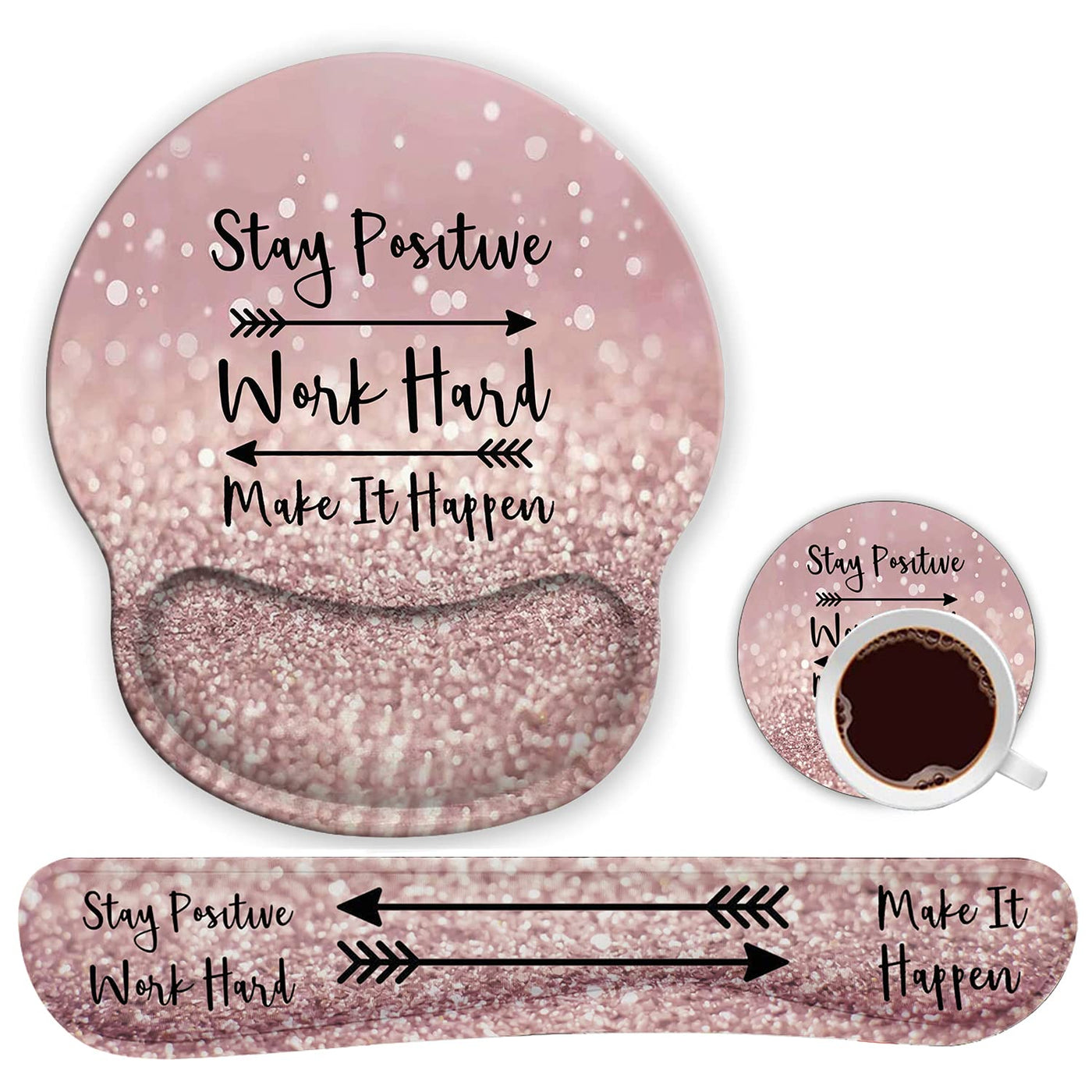 As A Professional Mouse Pad Seller, We Always Care About The Product Comfortability, We Sincerely Hope Our Mouse Pad Can Be Your Best Helper To Relief Your Wrist Pain Wherever You 'Re Working In The Office, Or Playing Games In Front Of A Computer.It Comes With A Thoughtful Coaster To Protect Your Desktop When Have A Cup Of Coffee Or Drink To Delight Yourself For A Moment.Material: Surface Fabric + Memory Foam + Gel Natural Rubber Keyboard Wrist Rest Pad Wrist Mouse Pad Size: 9.84*8.66 Inch Keyboard Wrist Support Size: 17.32*3.34 Inchraised Support Part Size: 0.98Inch.Package Contents: 1 X Wrist Mouse Pad; 1 X Keyboard Wrist Support; 1 X Cup Coasterour Mouse Pad Bundle Applies Smooth On The Surface To Ensure Your Mouse Can Move With No Barriers. The Rebound Memory Foam Will Bring You Enough Comfort And Protects Your Hands From Pain Or Fatigue. Bottom Rubber Base Provides Strong Grip To Prevent Slip So You Never Need Worry About The Unwanted Move Of You Mouse When You 'Re Working Or Playing. Rebound Memory Foammemory Foam Structure, Slow Bounces Back And Not Easy To Deform, Nice Ergonomic Shape, Comfortable For Typing Long Essays, And For Long Periods, Prevent You From Getting Carpel Tunnel. Reinforced Edges For Usemouse Pad Edges Had Been Reinforced To Ensure Long Hours Of Use. Delicate Pattern Designed To Show Your Unique Taste And Add Colors To Your Office.Anti-Skid Rubber Baseapplies Non-Slip Rubber Base On The Keyboard Wrist Pad Bottom To Prevent Unwanted Move When You Type With Hands On The Keyboard Pad.Anti-Skid Pu Baseapplies Non-Slip Pu Base On The Mouse Pad Bottom To Ensure Your Mouses Can Precise Positioning Without Disturbed By The Mouse Pad Move.