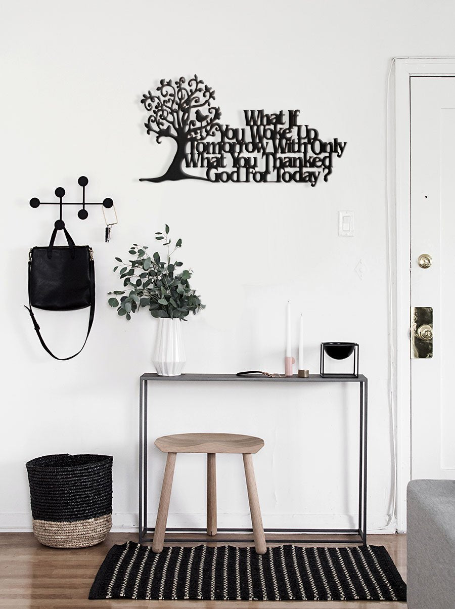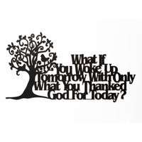 Q: What themes or styles does this wall sign feature?A: The wall sign features inspirational and Christian themes, specifically the quote 'What if you woke up tomorrow with only what you thanked God for today?', making it a meaningful addition to any decor style from rustic to modern.
