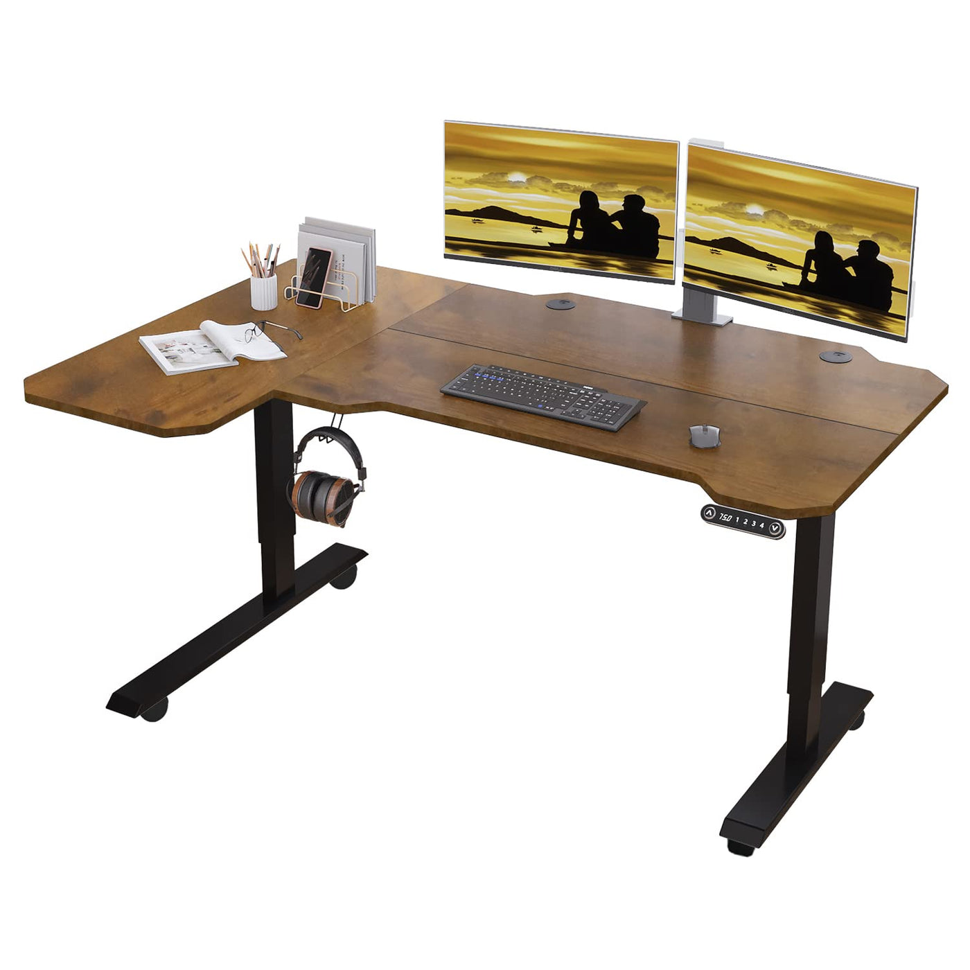 Jceet Adjustable Height L-Shaped 59 Inch Electric Standing Desk - Sit Stand Computer Desk With 3 Splice Board, Lockable Casters, Stand Up Desk Table For Home Office, Black Frame And Rustic Brown Top